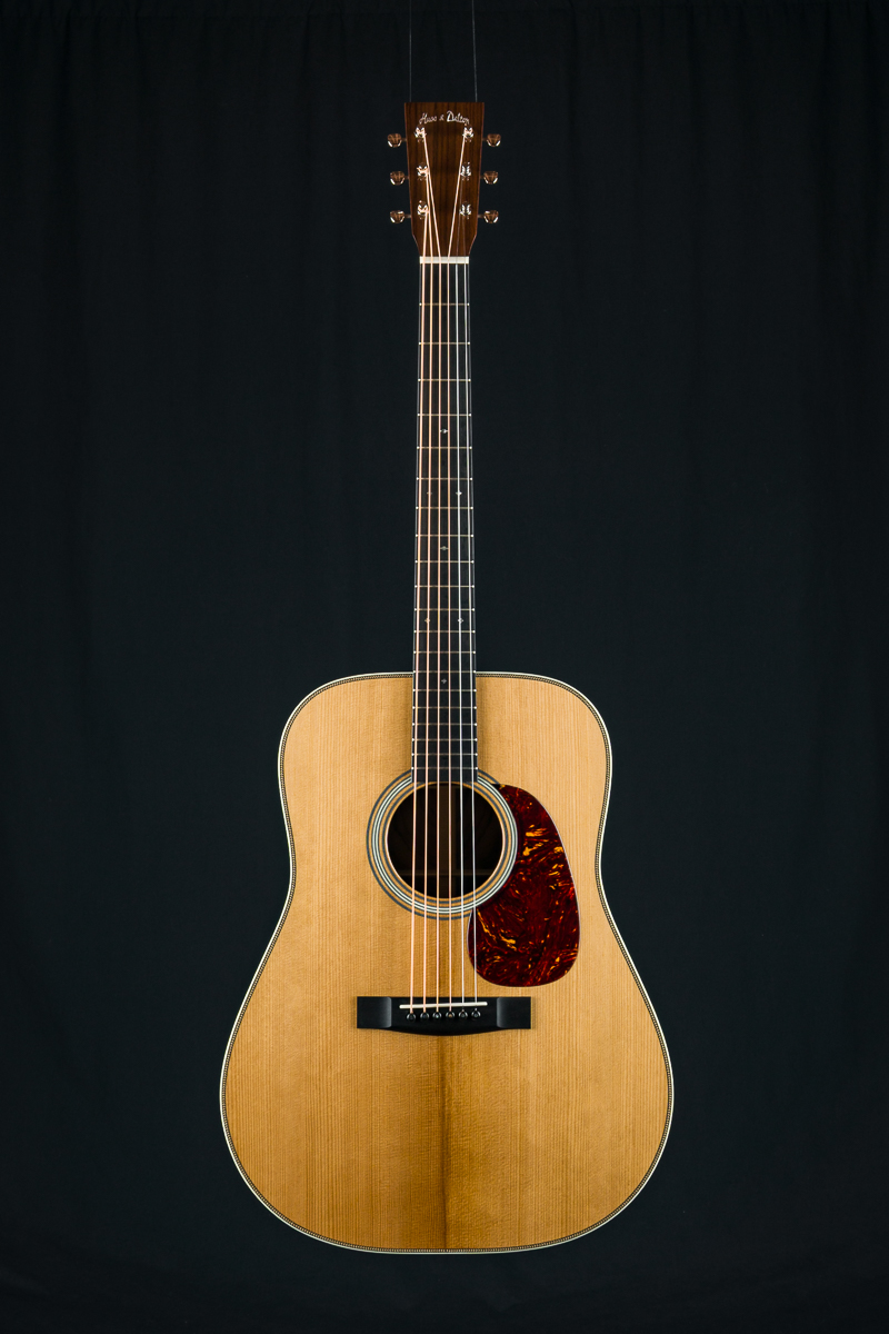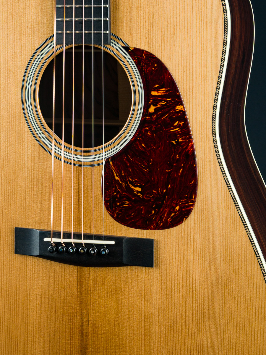 Other features include Mahogany neck, Ebony fretboard and bridge, Adirondack Spruce forward shifted braces, Indian Rosewood headstock overlay, TD-R style ring rosette, Abalone Pearl square and diamond fretboard inlays, Nickel Gotoh tuners with oval buttons, Ivoroid heelcap and wedge and more. Large full bass with forward mids and clear highs, perfect to cut through any jam. The custom 1 11/16″ nut width makes this very comfortable to play.