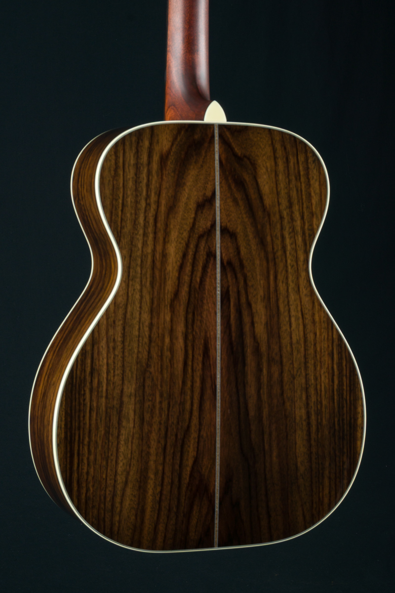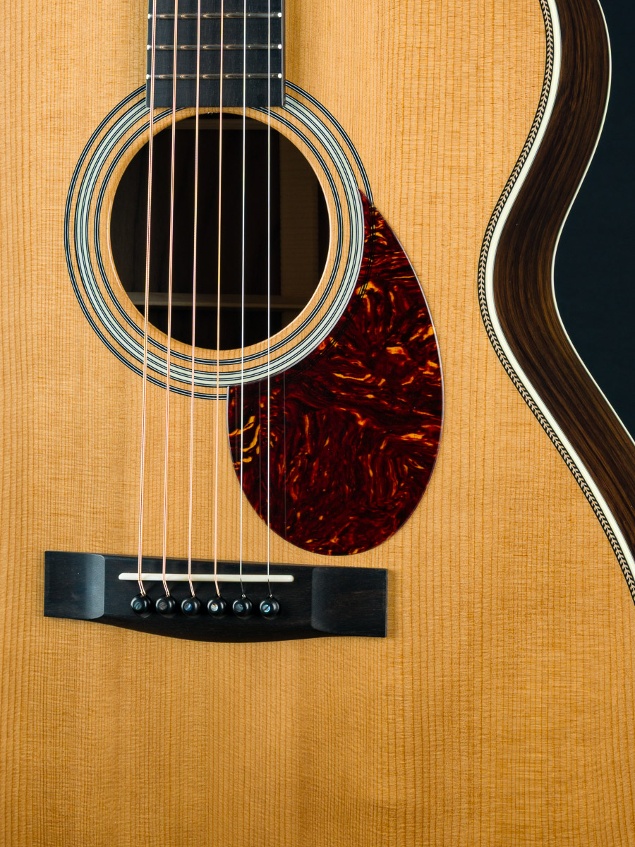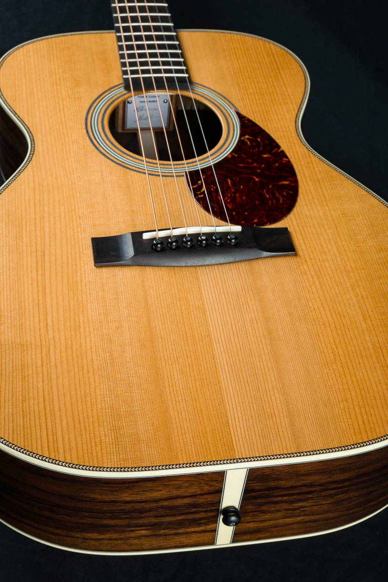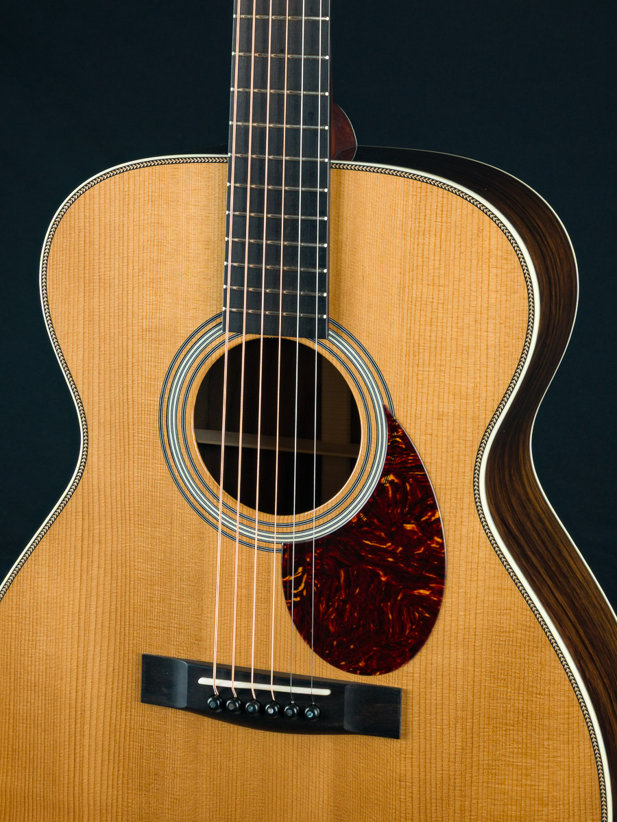Huss & Dalton’s TOM-R is their traditional flat top OM designed for the versatile mix of flatpicking and fingerpicking. The even response and airy, shimmery qualities the OM has always been known for are maintained and expanded on in this boutique build with classic timeless styling. The TOM-R Thermo-Cured torrefied Adirondack Red Spruce and Wild Grain Indian Rosewood traditional flat-top construction with Adirondack Spruce bracing, used in all Huss & Daltons, is especially suited for finger-style players or flatpickers with a lighter touch, yet holds up to vigorous strumming when the performance becomes more intense.