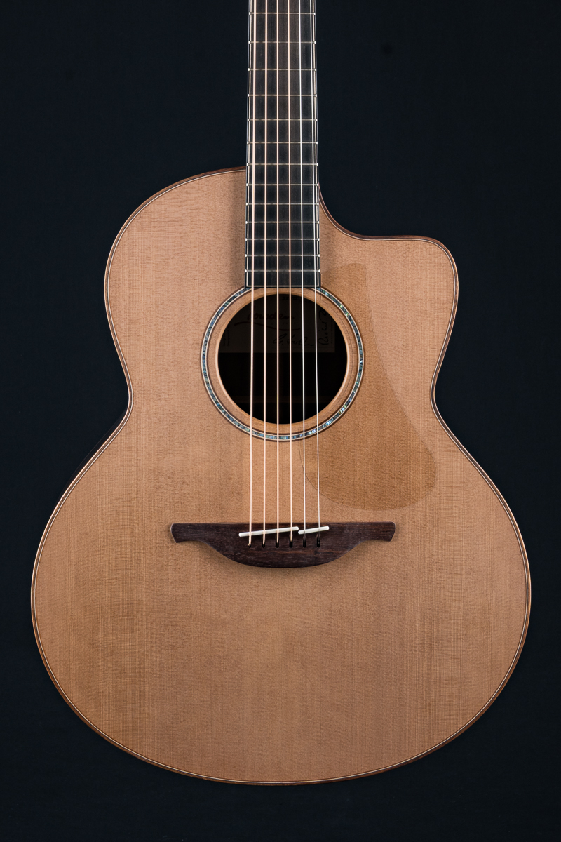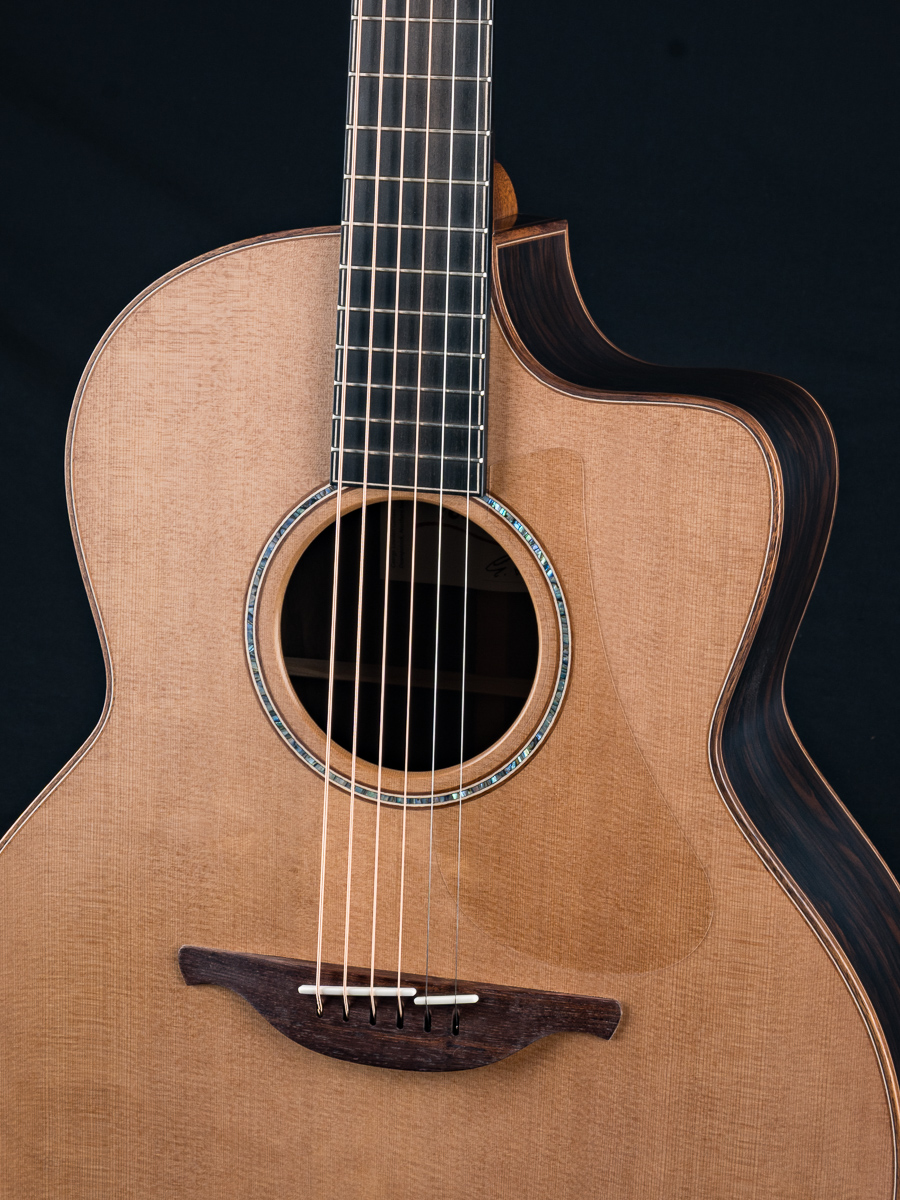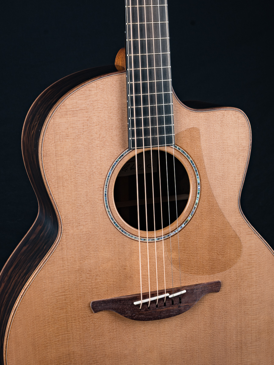 George Lowden worked closely with world renown guitarist Richard Thompson on the creation of this signature model. Built on Lowden’s F body size, a mid jumbo with cutaway, they added the premium tonewood combination of AAAA grade Cedar and Ziricote for amazing clarity for fingerstyle and flatpicking with the full body tone and response Richard Thompson was looking for. Perfect for DADGAD down tuning, heavy rhythm strumming or flatpicking, this guitar excels for the stage, recording studio or your living room. Other featured include Figured Koa bindings, Abalone rosette, 5-piece Mahogany, Rosewood and Walnut neck, multi-wood purflings, Gotoh Gold 510 tuners with Ebony buttons and more.