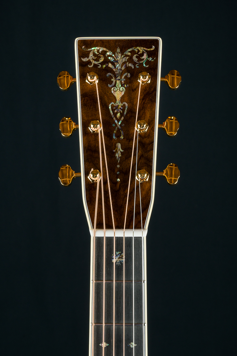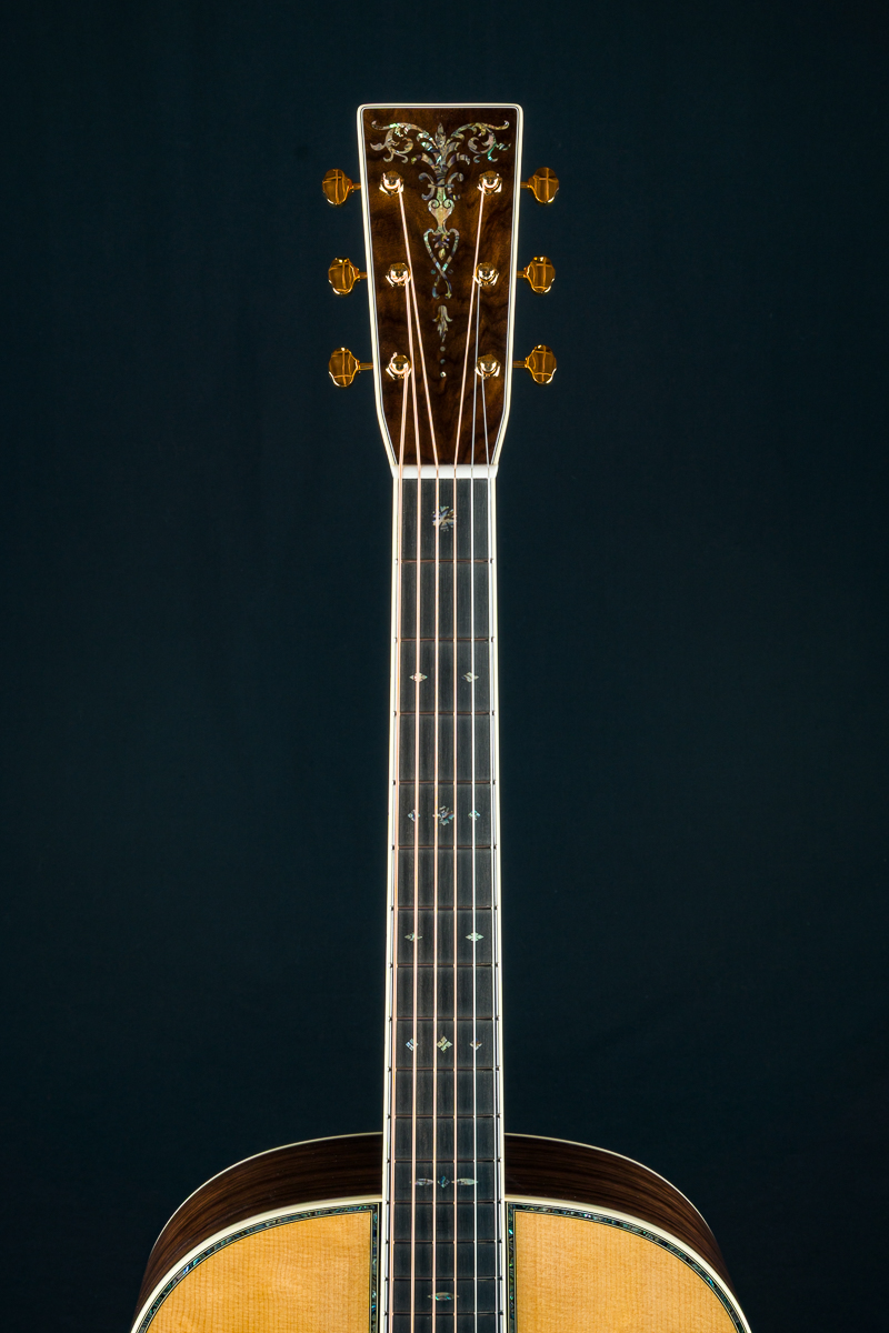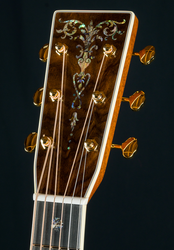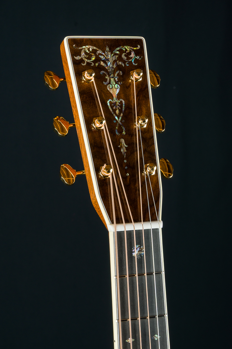 Other features include Black Ebony fretboard and bridge, Premium Wild Grain East Indian Rosewood headstock overlay, antique white body bindings including heelcap and wedge, style-45 Mosaic backstrip, low profile neck shape, Gold Grover butterbean tuners, Bone nut and drop in saddle, White pins with Paua Pearl dots, 1 11/16″ nut width, 2 1/8″ saddle spacing, 25.4″ scale length and more.