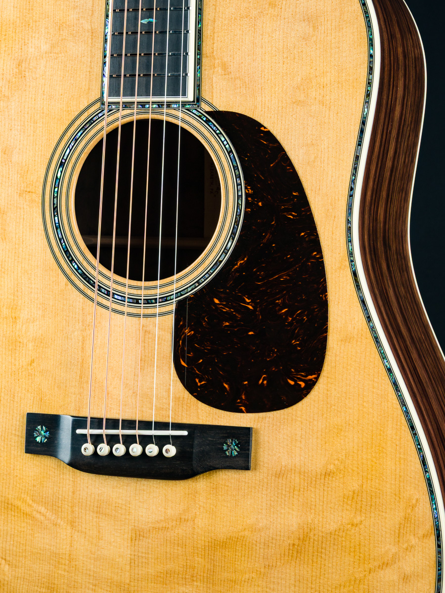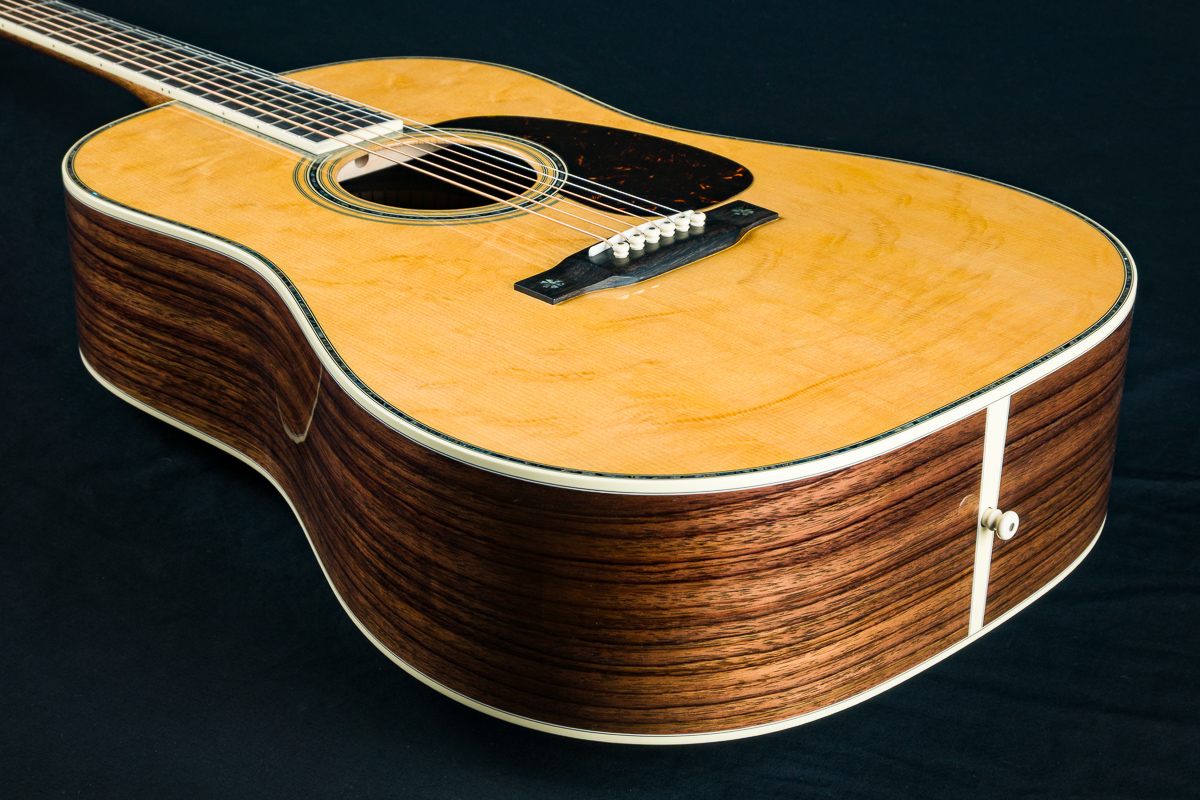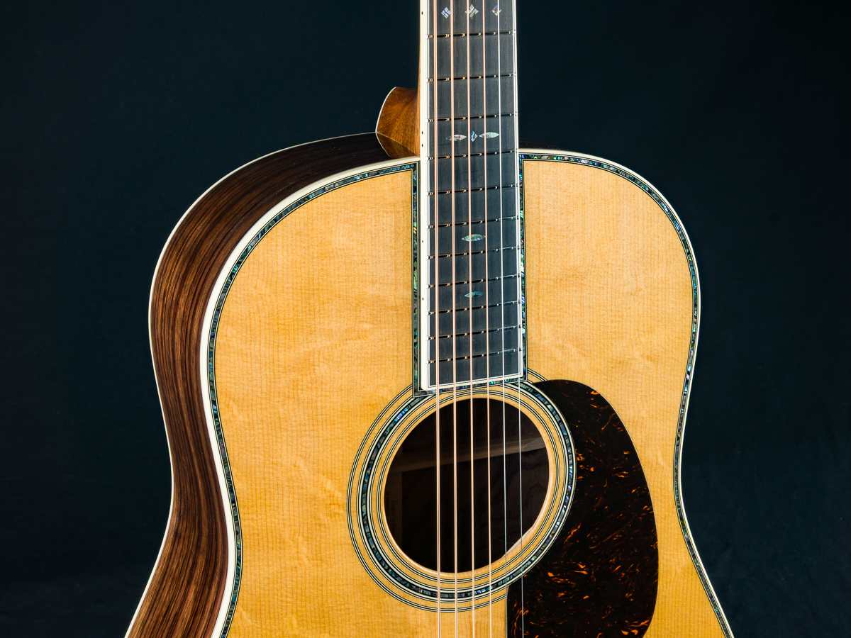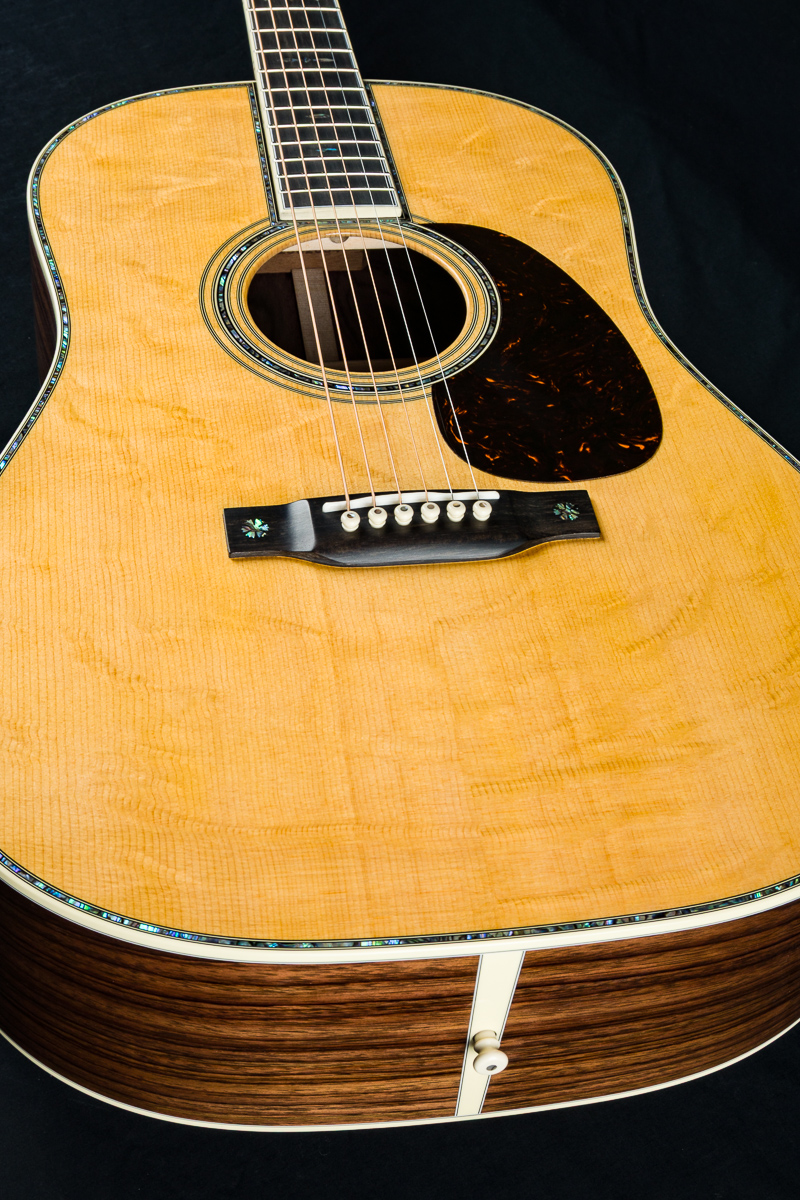 Other features include Black Ebony fretboard and bridge, Premium Wild Grain East Indian Rosewood headstock overlay, antique white body bindings including heelcap and wedge, style-45 Mosaic backstrip, low profile neck shape, Gold Grover butterbean tuners, Bone nut and drop in saddle, White pins with Paua Pearl dots, 1 11/16″ nut width, 2 1/8″ saddle spacing, 25.4″ scale length and more.