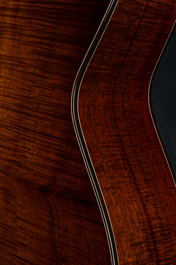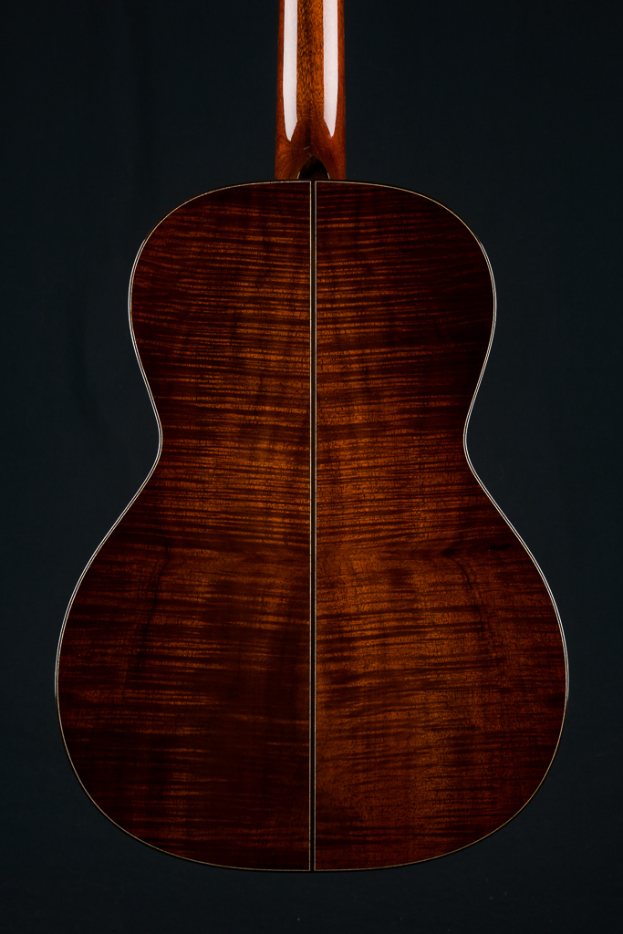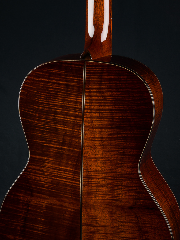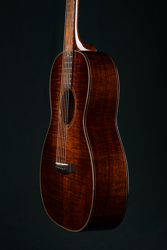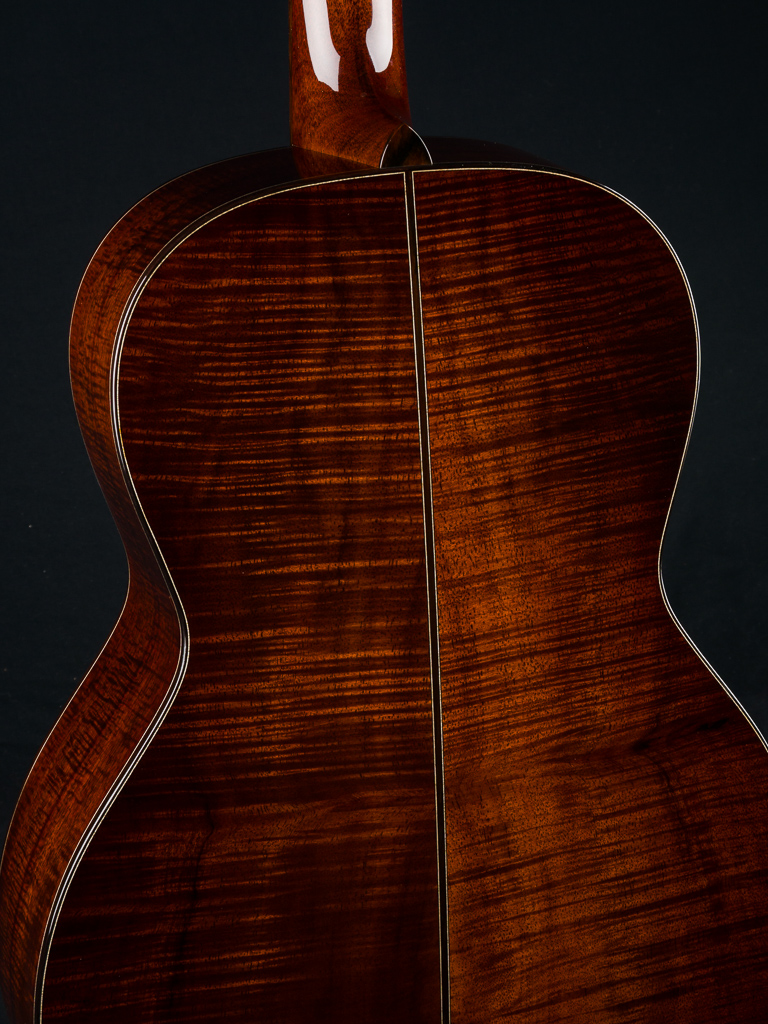 This custom 12-fret 000 model is crafted with a premium highly Flamed Hawaiian Koa top, back, and sides, finished in a rich, custom reddish tobacco burst. Under the hood, it features Adirondack Spruce scalloped bracing and traditional Hot Hide Glue construction- the same used on the legendary “Golden Era” instruments. Other standout custom features include a Brazilian Rosewood fretboard and bridge with striking contrast and figuring, especially between the 2nd and 12th frets, along with matching Brazilian Rosewood bindings on the body, fretboard, and headstock, plus back and end strips. The Mahogany neck features a classic slotted headstock topped with a matching Flamed Koa overlay, while a Brazilian Rosewood rosette adds an elegant finishing touch to the top and Waverly Gold tuners with Snakewood buttons complete the refined aesthetic.
