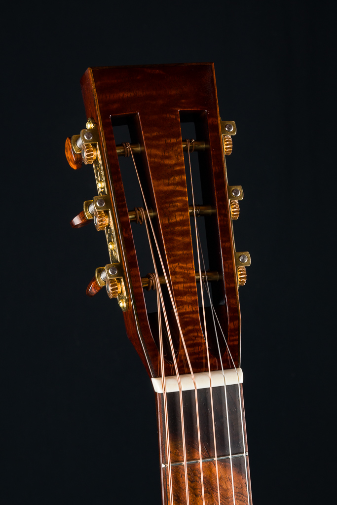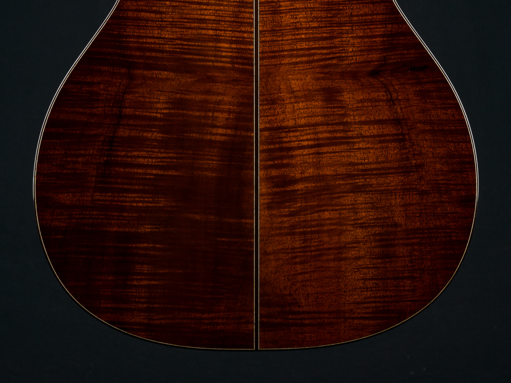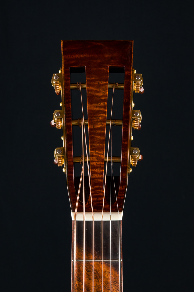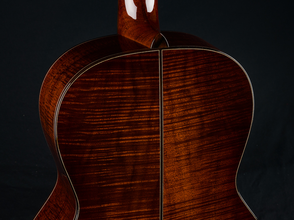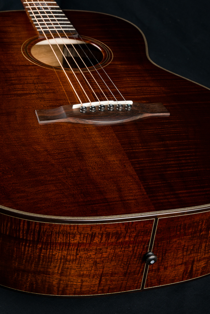 This custom 12-fret 000 model is crafted with a premium highly Flamed Hawaiian Koa top, back, and sides, finished in a rich, custom reddish tobacco burst. Under the hood, it features Adirondack Spruce scalloped bracing and traditional Hot Hide Glue construction- the same used on the legendary “Golden Era” instruments. Other standout custom features include a Brazilian Rosewood fretboard and bridge with striking contrast and figuring, especially between the 2nd and 12th frets, along with matching Brazilian Rosewood bindings on the body, fretboard, and headstock, plus back and end strips. The Mahogany neck features a classic slotted headstock topped with a matching Flamed Koa overlay, while a Brazilian Rosewood rosette adds an elegant finishing touch to the top and Waverly Gold tuners with Snakewood buttons complete the refined aesthetic.