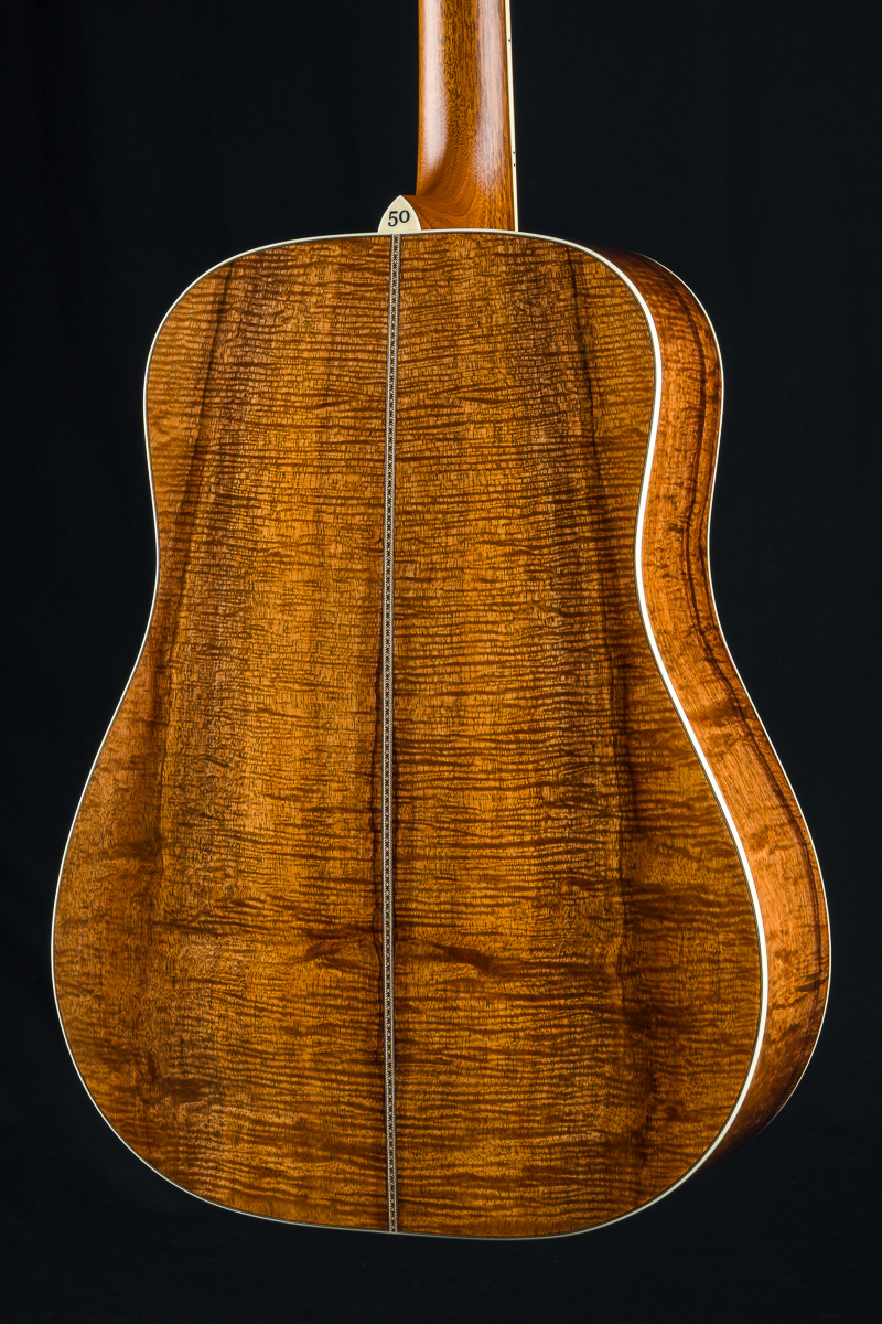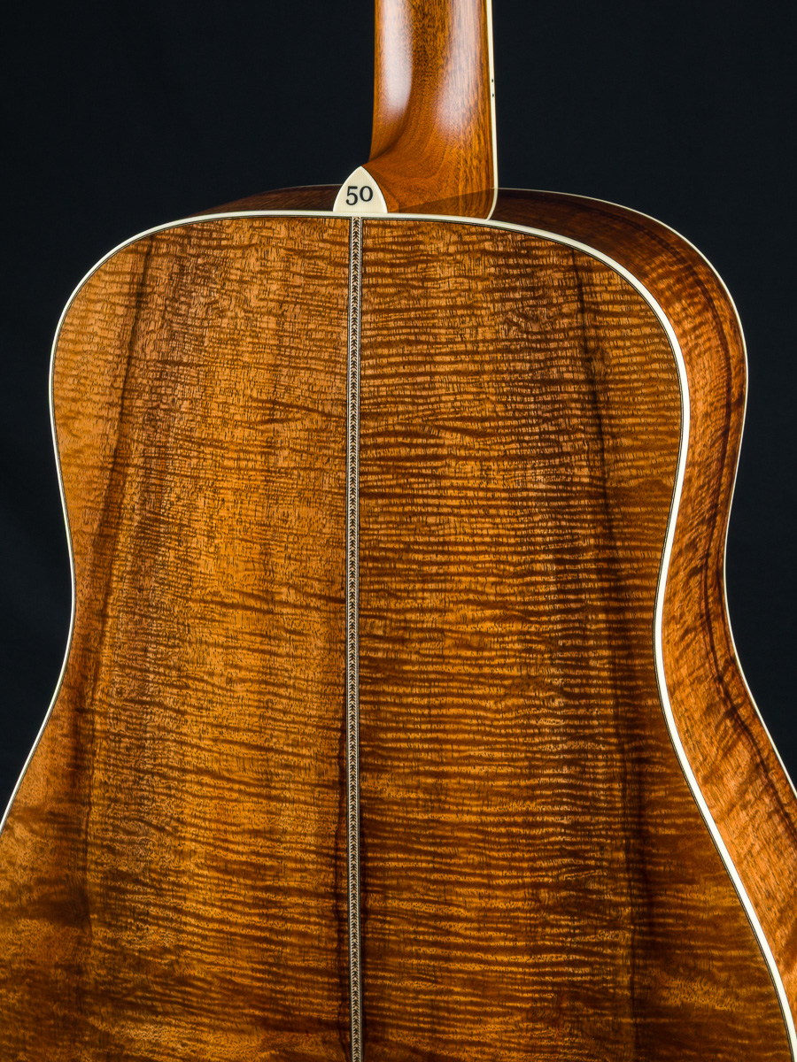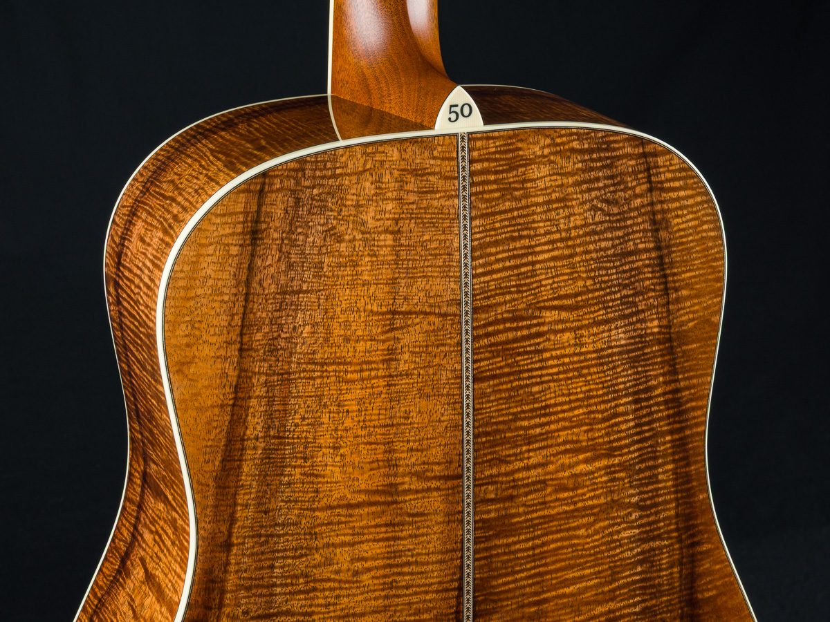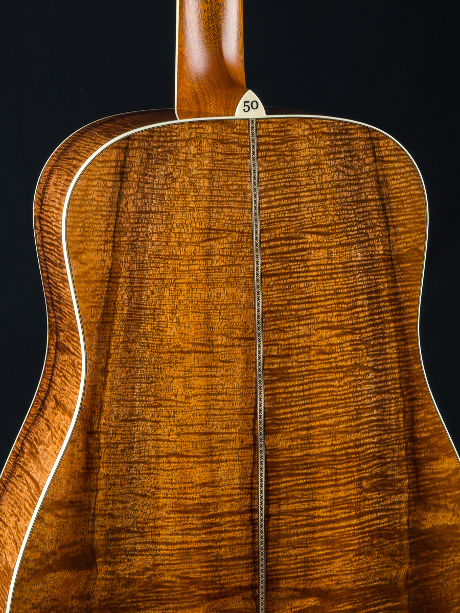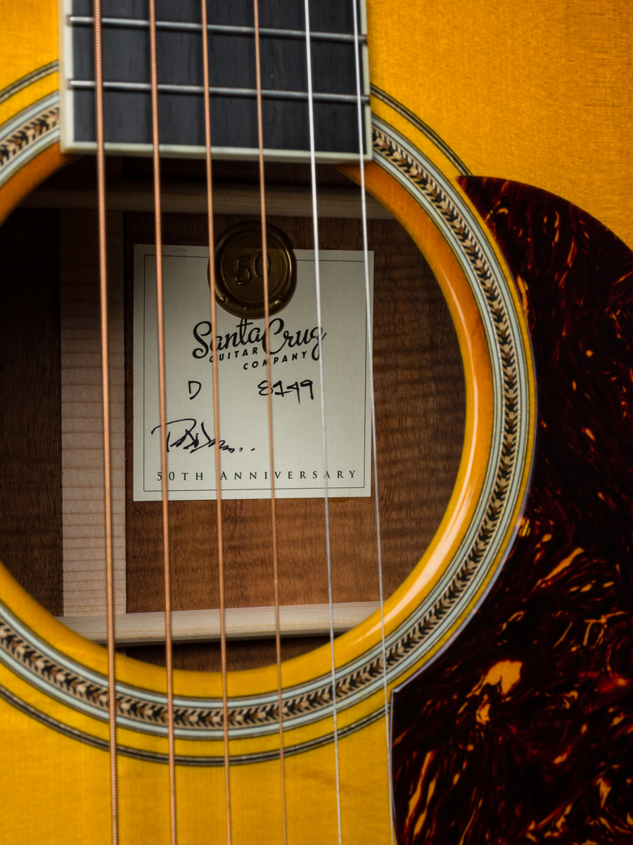 The Santa Cruz D 50th Anniversary is built with highly figured Hawaiian Koa back and sides paired with a premium Bearclaw Italian Spruce top with Georgia Peach Sunburst finish. Features Include Clementine Cowgirl Pearl and wood headstock inlay and star at the 5th fret inlay, Ivoroid heelcap with 50 inlay, 50th Anniversary interior label with wax seal signed my Richard Hoover, Ivoroid full body, fretboard and headstock bindings, S29 top purfling, rosette and backstrip, Adirondack Spruce bracing with Hot Hide Glue, Mahogany neck with haircut headstock, Ebony fretboard and bridge, Waverly Gold tuners with Ivoroid butterbean tuners, Ebony headstock overlay, Bone pins, 1 11/16″ nut width, 2 3/16″ saddle spacing, 25.375″ scale length and more.