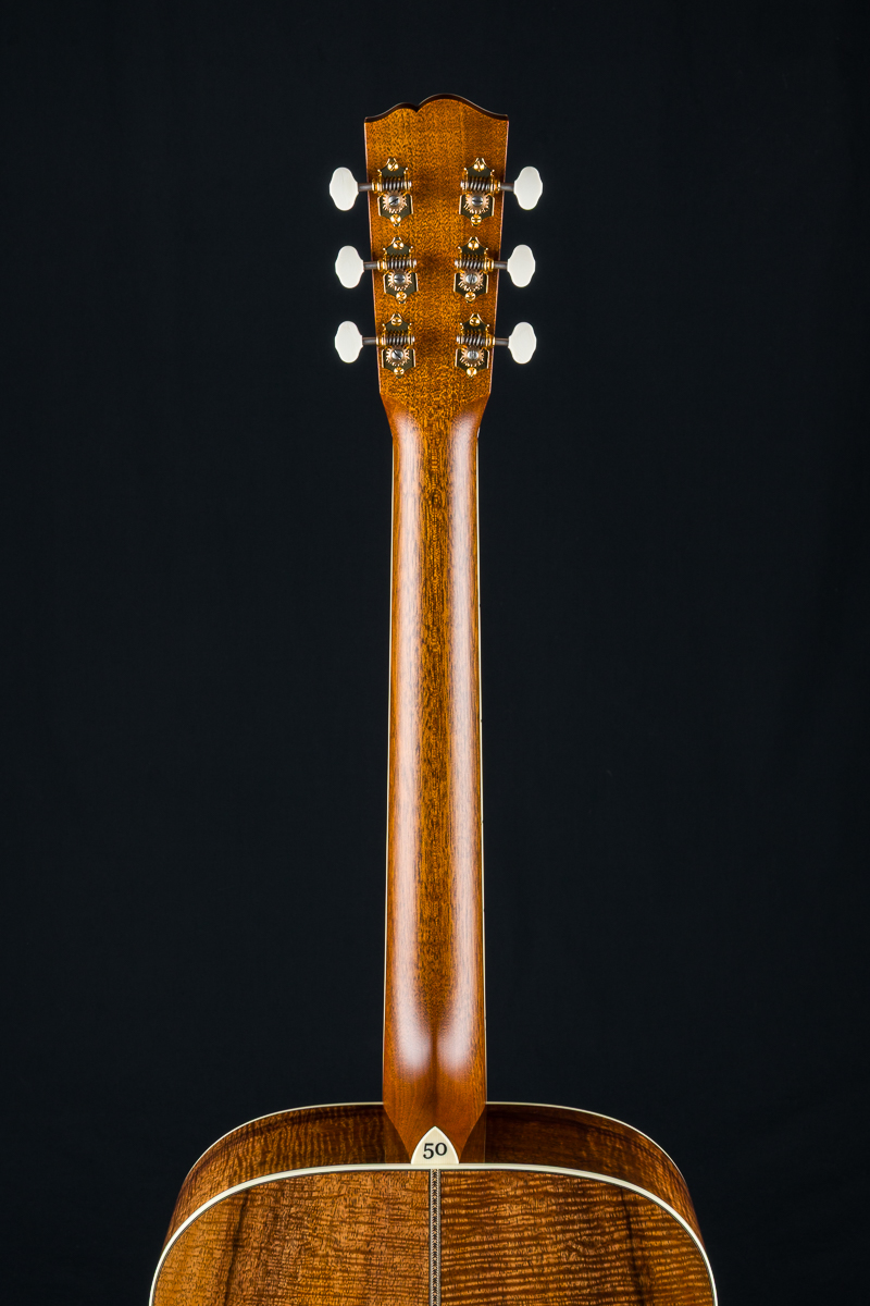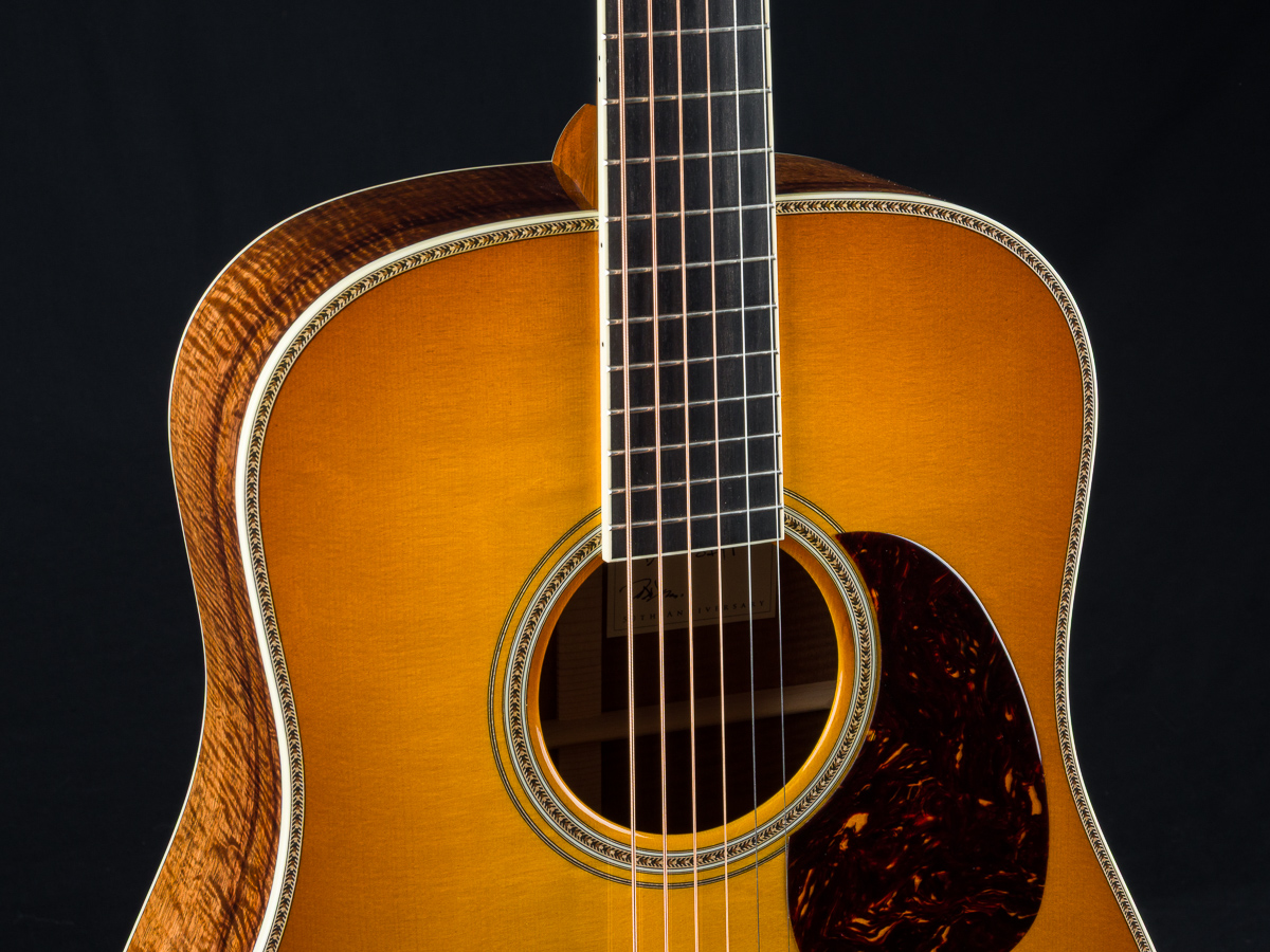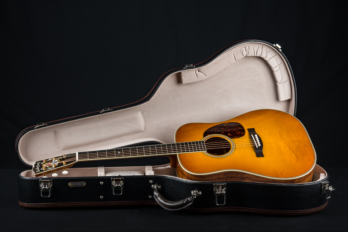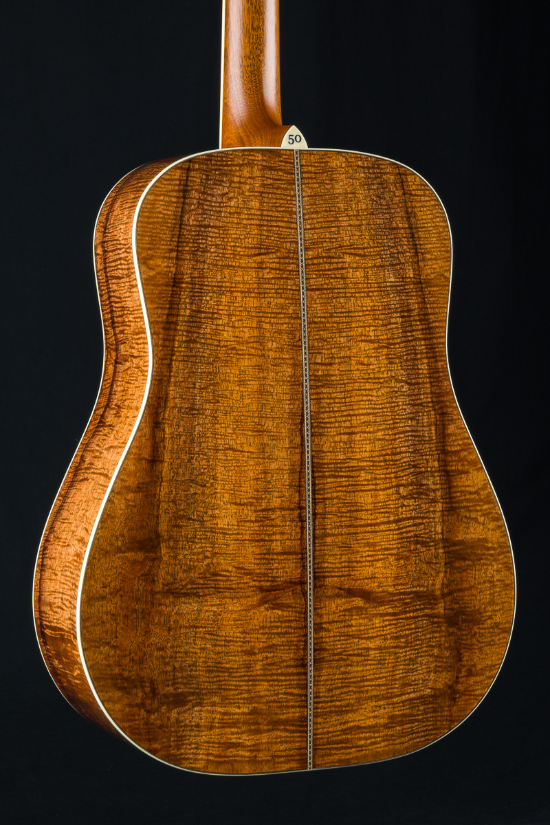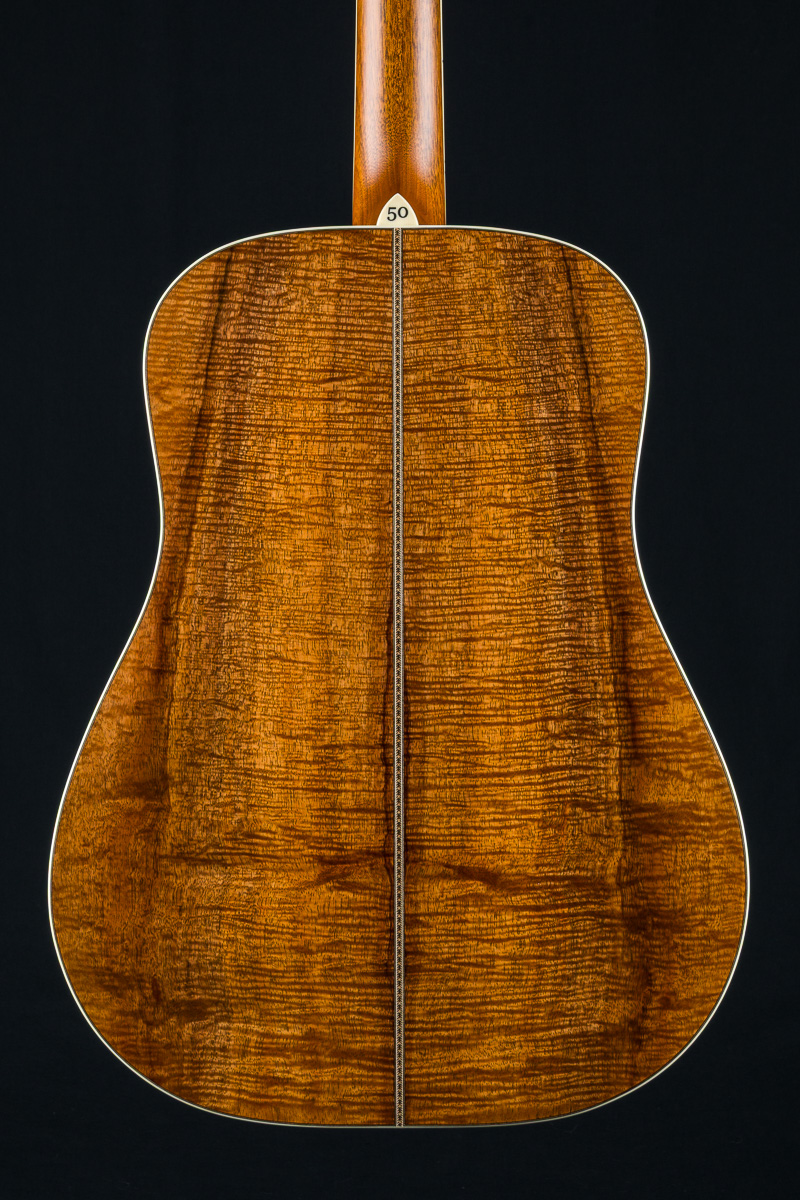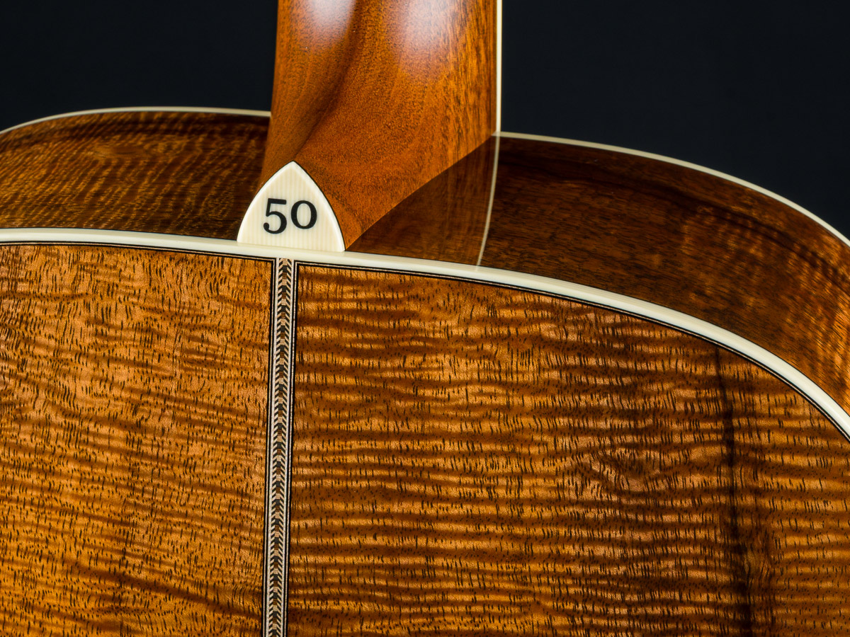 The Santa Cruz D 50th Anniversary is built with highly figured Hawaiian Koa back and sides paired with a premium Bearclaw Italian Spruce top with Georgia Peach Sunburst finish. Features Include Clementine Cowgirl Pearl and wood headstock inlay and star at the 5th fret inlay, Ivoroid heelcap with 50 inlay, 50th Anniversary interior label with wax seal signed my Richard Hoover, Ivoroid full body, fretboard and headstock bindings, S29 top purfling, rosette and backstrip, Adirondack Spruce bracing with Hot Hide Glue, Mahogany neck with haircut headstock, Ebony fretboard and bridge, Waverly Gold tuners with Ivoroid butterbean tuners, Ebony headstock overlay, Bone pins, 1 11/16″ nut width, 2 3/16″ saddle spacing, 25.375″ scale length and more.