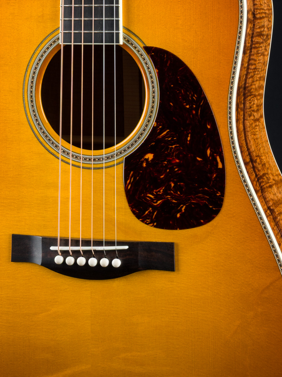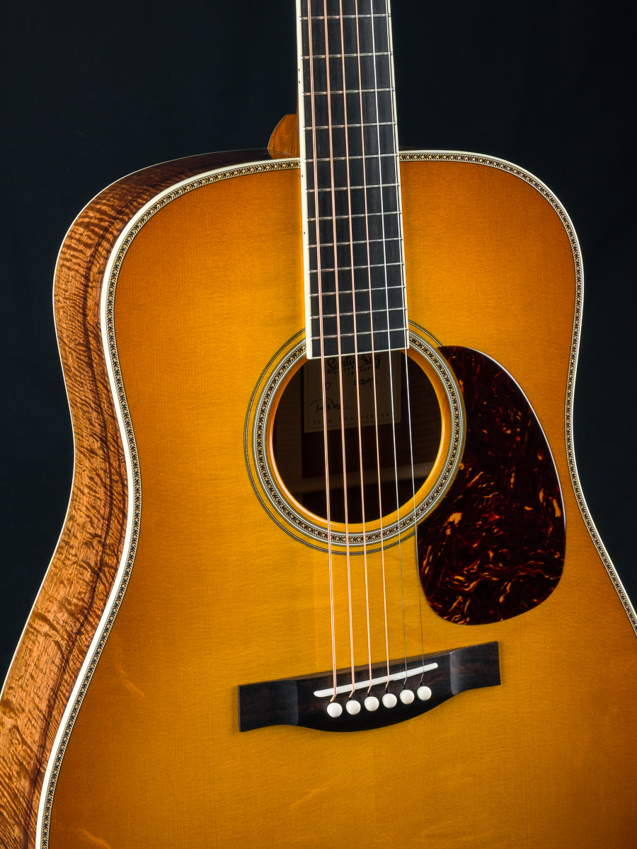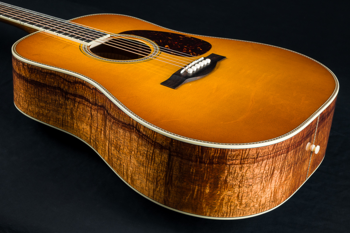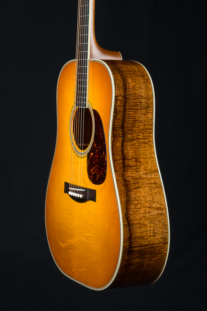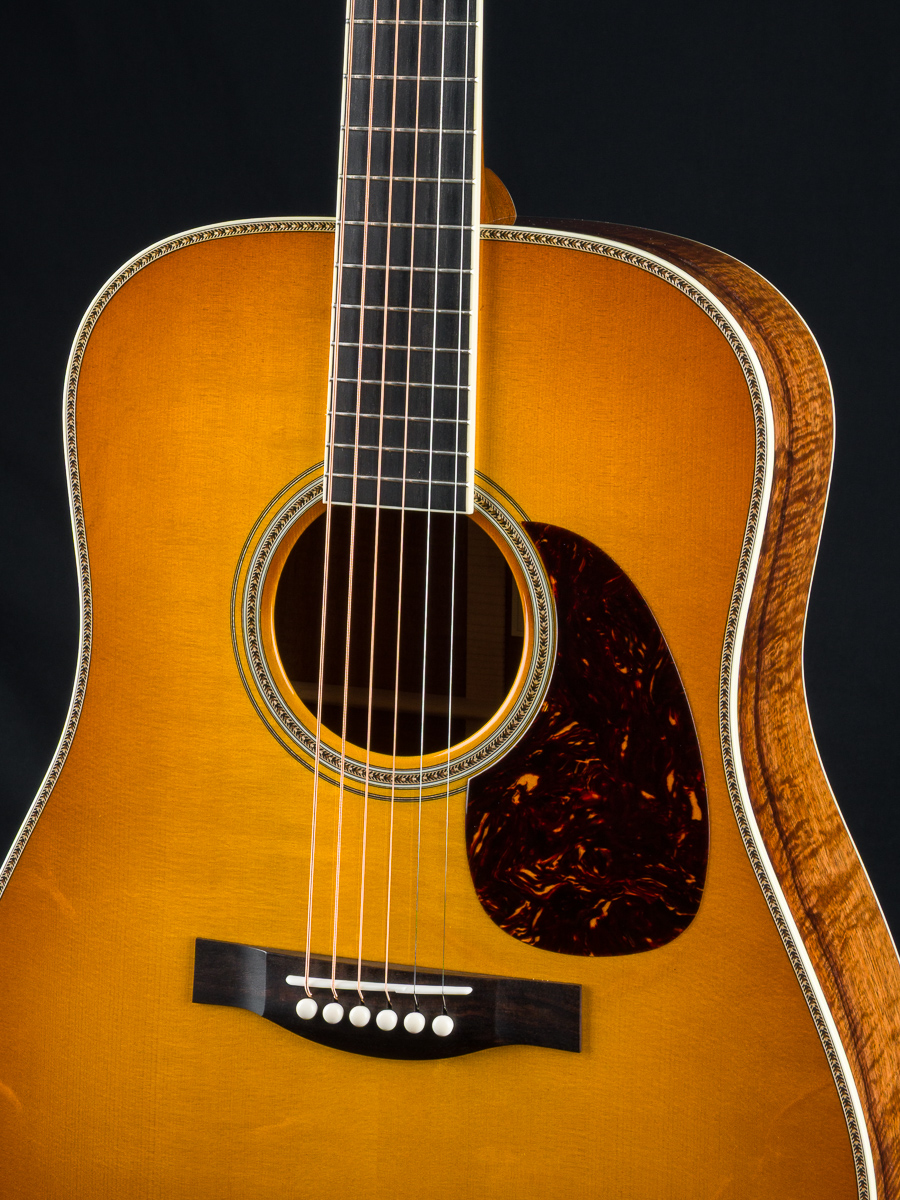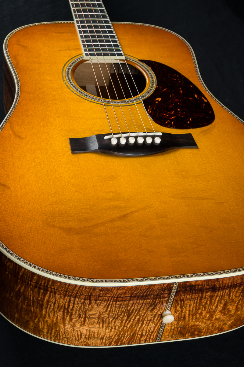 The Santa Cruz D 50th Anniversary is built with highly figured Hawaiian Koa back and sides paired with a premium Bearclaw Italian Spruce top with Georgia Peach Sunburst finish. Features Include Clementine Cowgirl Pearl and wood headstock inlay and star at the 5th fret inlay, Ivoroid heelcap with 50 inlay, 50th Anniversary interior label with wax seal signed my Richard Hoover, Ivoroid full body, fretboard and headstock bindings, S29 top purfling, rosette and backstrip, Adirondack Spruce bracing with Hot Hide Glue, Mahogany neck with haircut headstock, Ebony fretboard and bridge, Waverly Gold tuners with Ivoroid butterbean tuners, Ebony headstock overlay, Bone pins, 1 11/16″ nut width, 2 3/16″ saddle spacing, 25.375″ scale length and more.