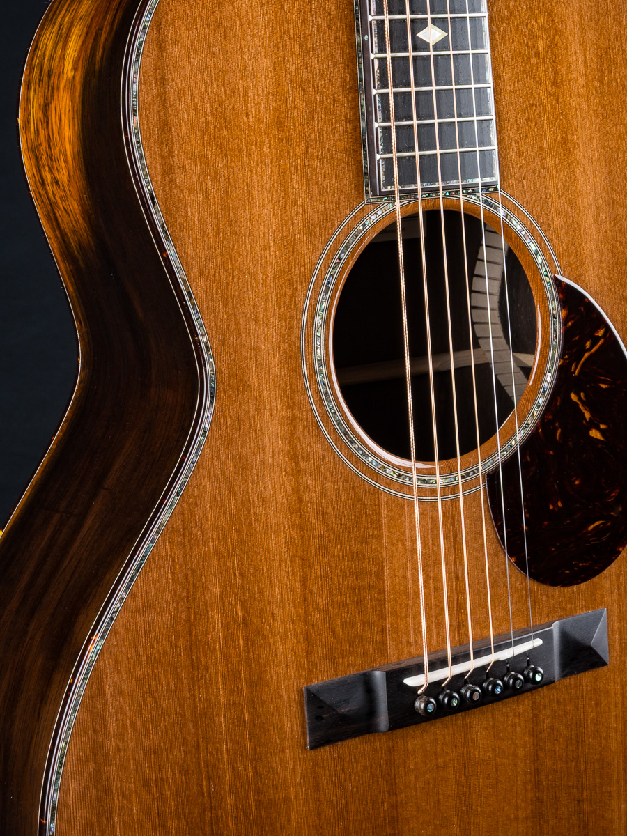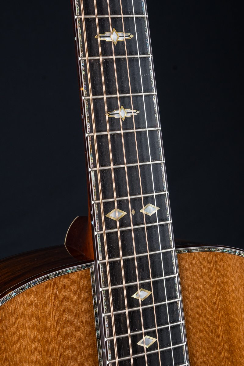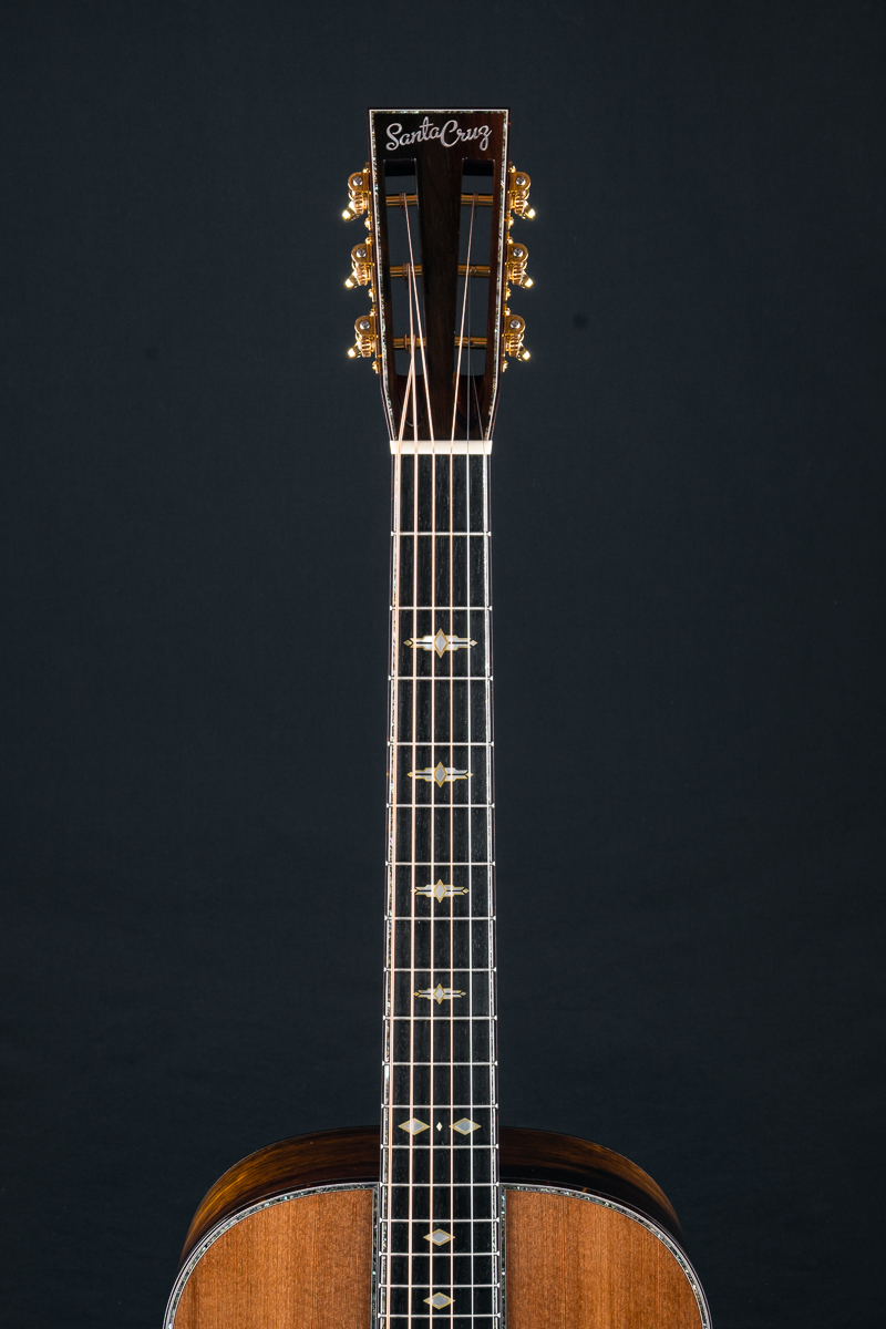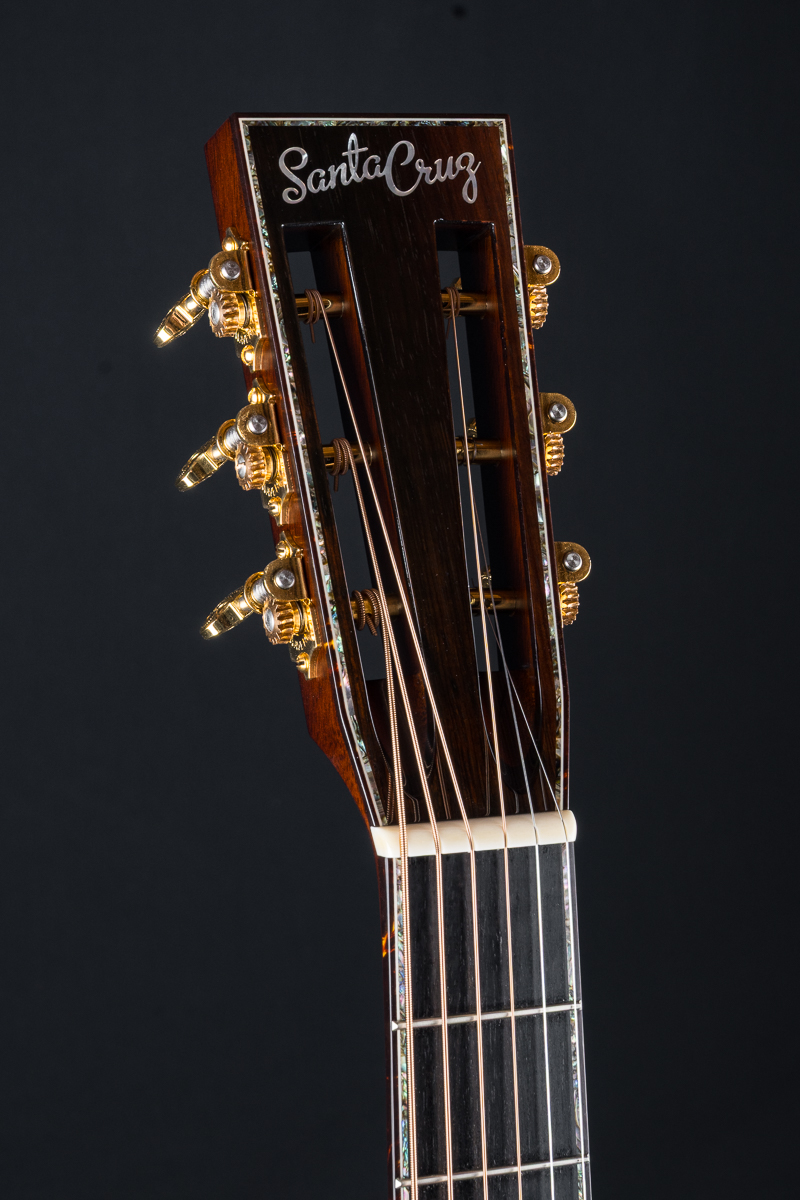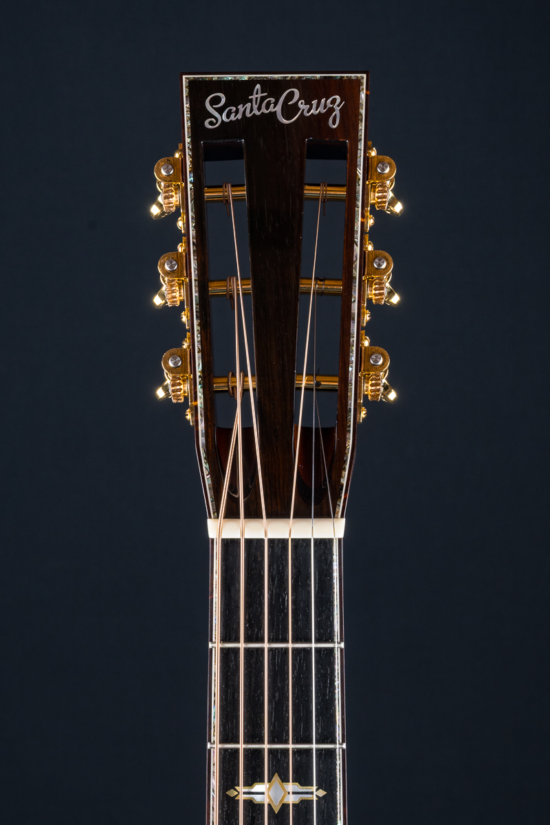 Other features include Bryn Athyn Cathedral Brazilian Rosewood peghead overlay, Ebony fretboard and pyramid bridge, Mother of Pearl Santa Cruz script logo, Moderne Vault fingerboard inlay, Waverly Gold engraved tuners, Adirondack Spruce bracing, Hide Glue construction, Mahogany neck with slotted headstock, Ebony pins with Abalone dots, 1 3/4″ nut width, 25.375″ scale length and more.