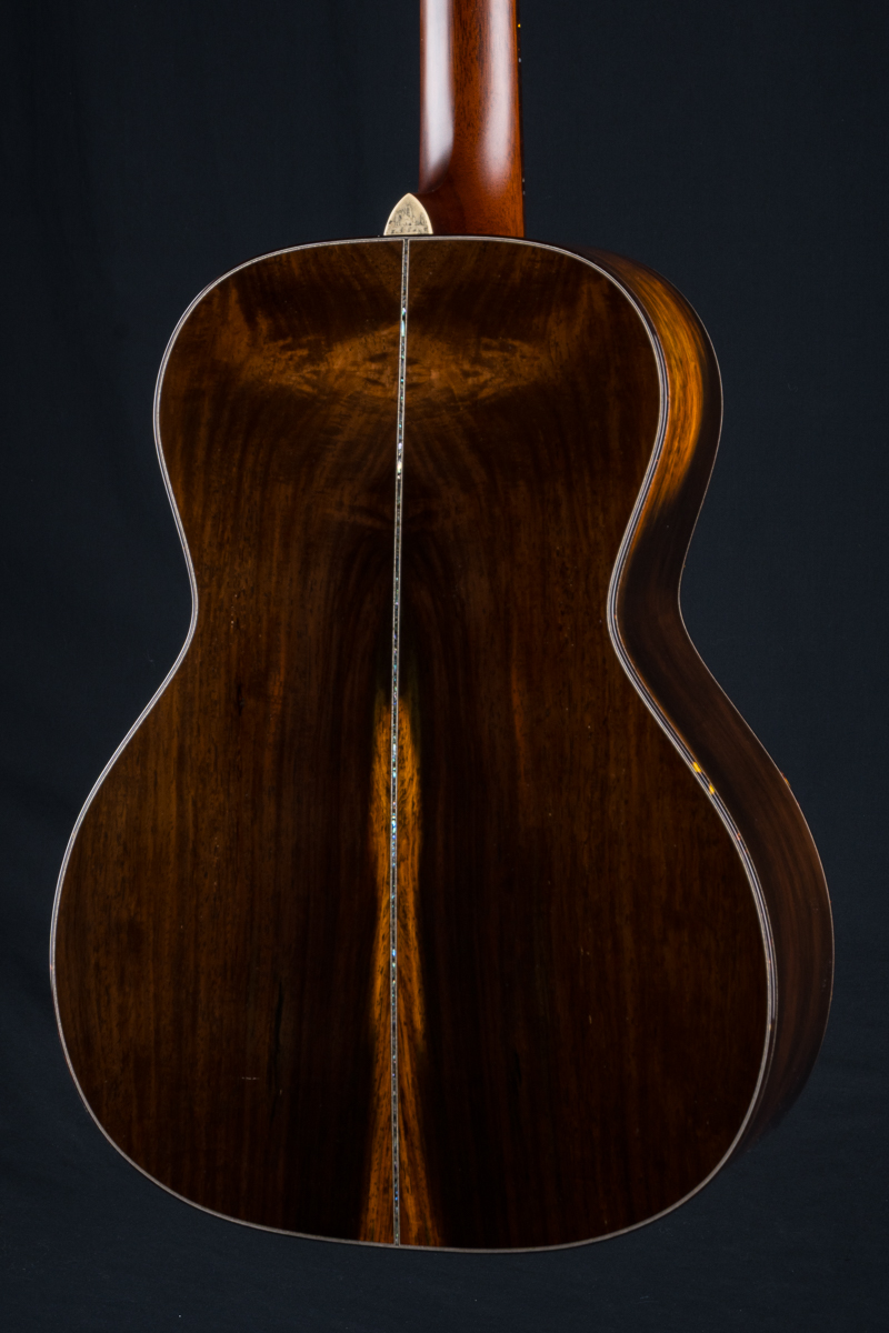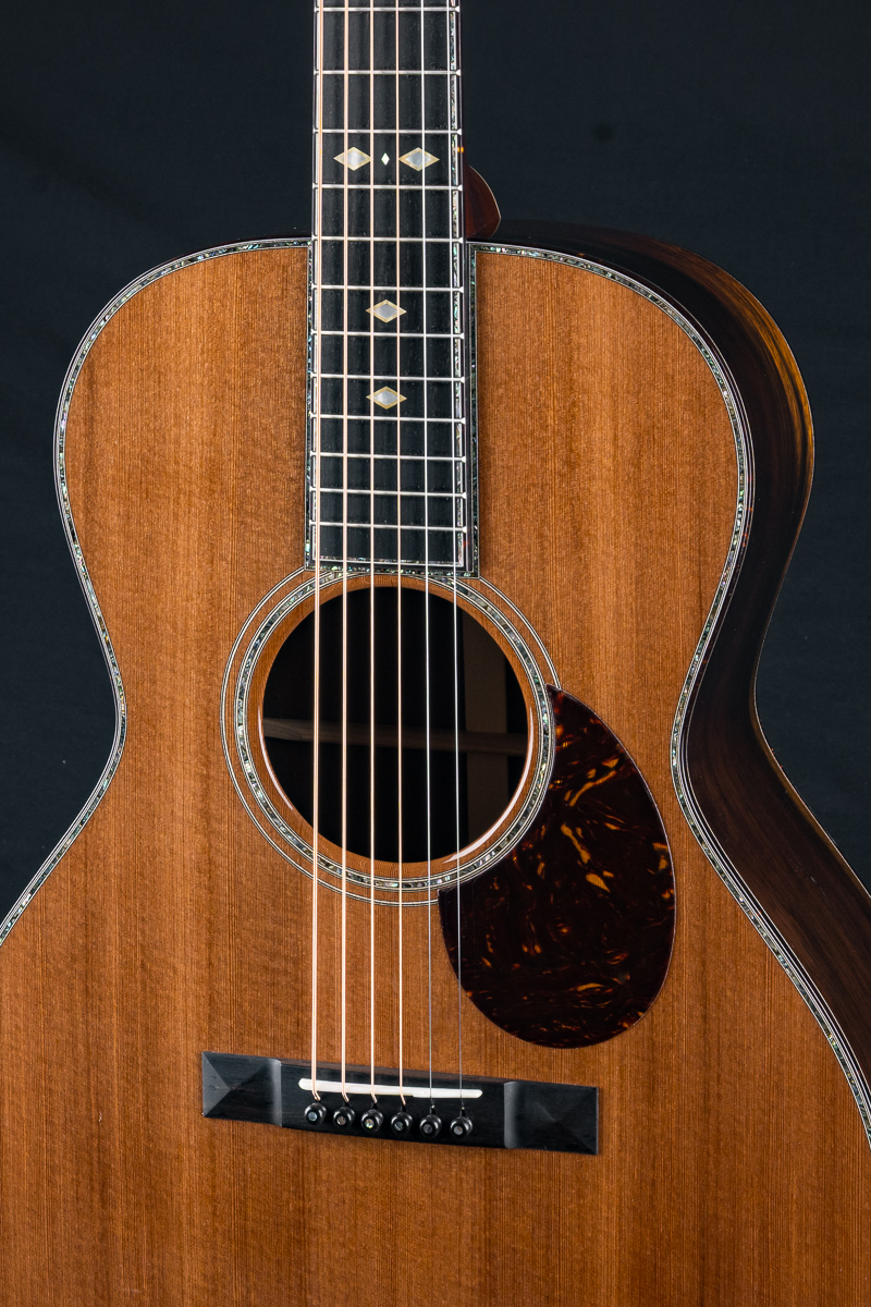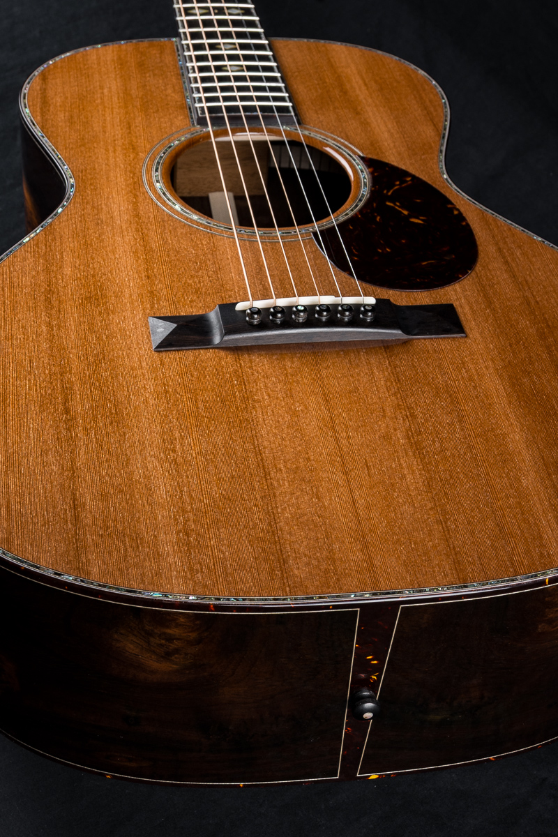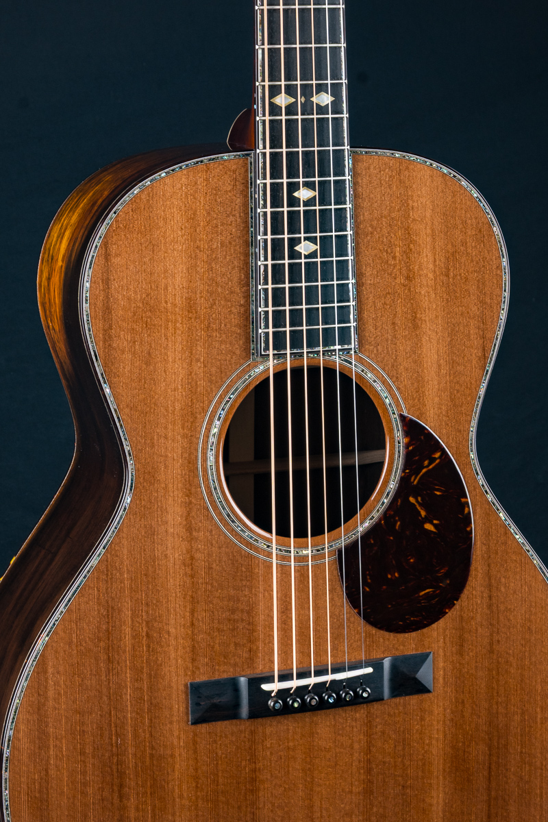 Other features include Bryn Athyn Cathedral Brazilian Rosewood peghead overlay, Ebony fretboard and pyramid bridge, Mother of Pearl Santa Cruz script logo, Moderne Vault fingerboard inlay, Waverly Gold engraved tuners, Adirondack Spruce bracing, Hide Glue construction, Mahogany neck with slotted headstock, Ebony pins with Abalone dots, 1 3/4″ nut width, 25.375″ scale length and more.