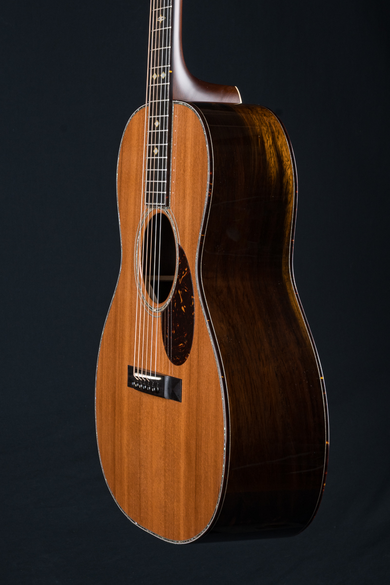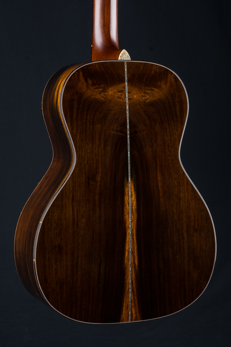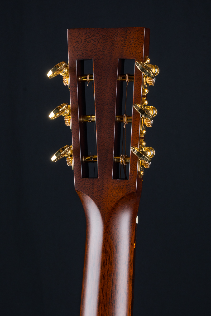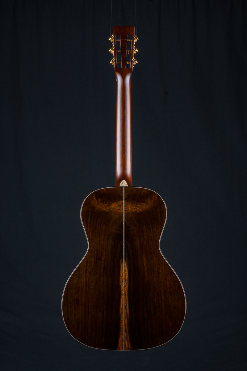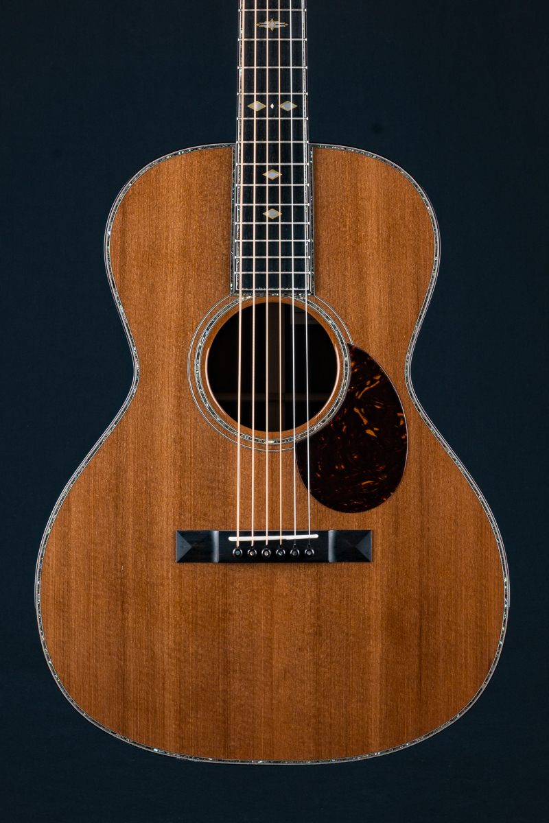 Other features include Bryn Athyn Cathedral Brazilian Rosewood peghead overlay, Ebony fretboard and pyramid bridge, Mother of Pearl Santa Cruz script logo, Moderne Vault fingerboard inlay, Waverly Gold engraved tuners, Adirondack Spruce bracing, Hide Glue construction, Mahogany neck with slotted headstock, Ebony pins with Abalone dots, 1 3/4″ nut width, 25.375″ scale length and more.