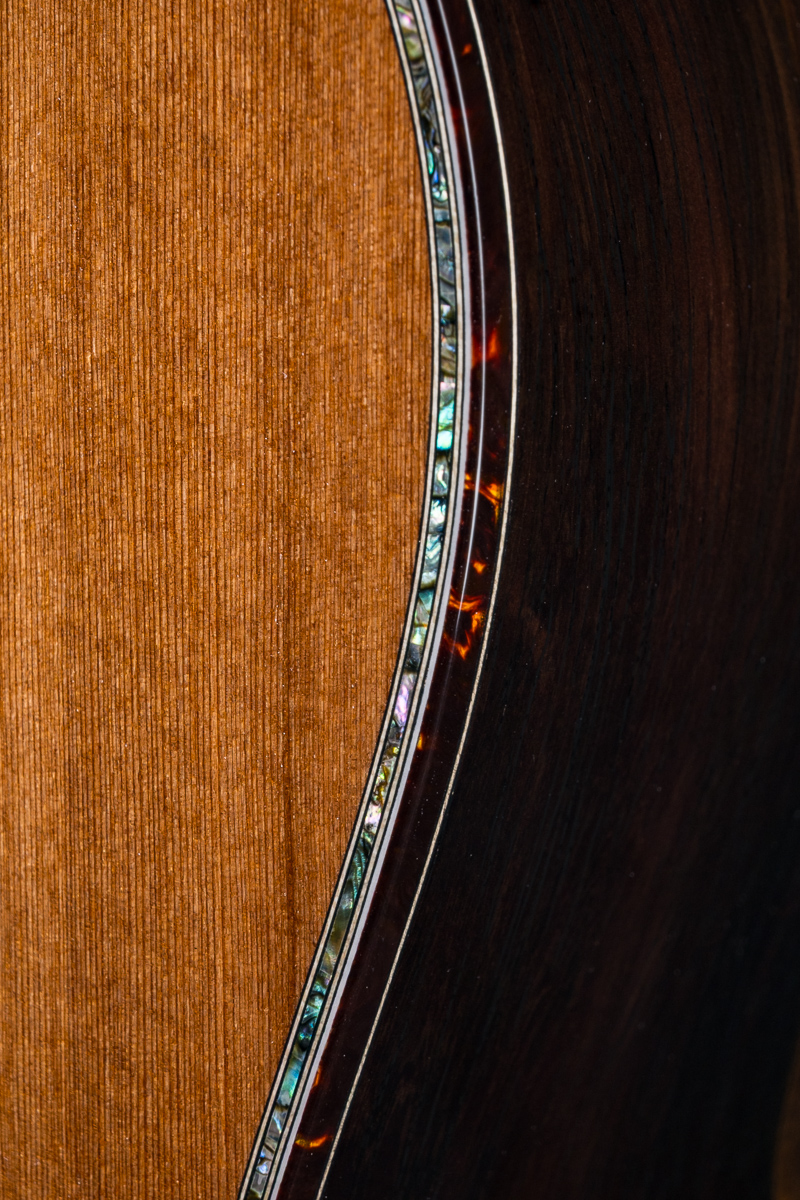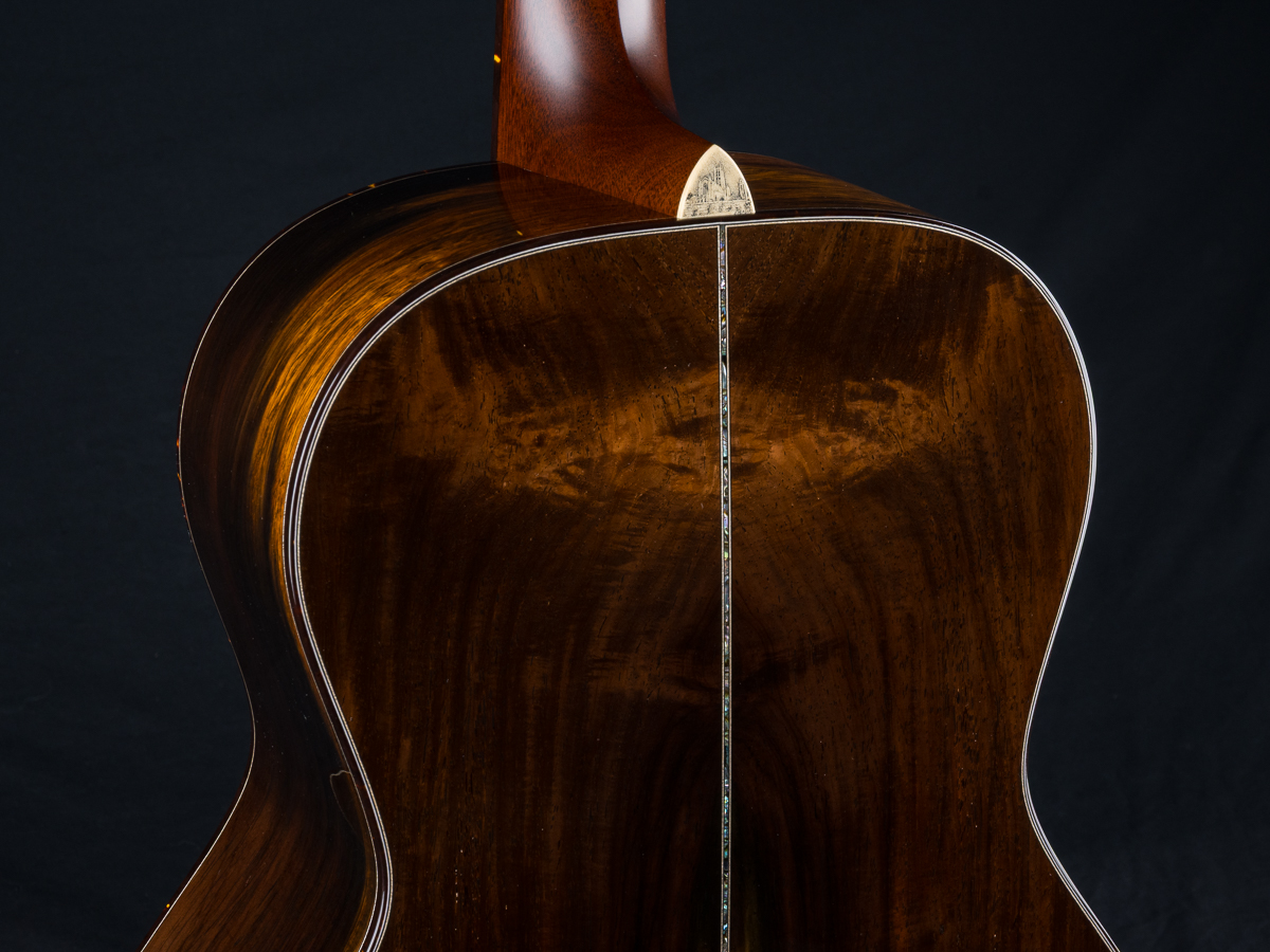 The H13 Cathedral features Abalone Pearl 42-style top purfling, rosette, fretboard trim, headstock trim and back strip, Gold Pearl and Mother of Pearl Moderne fretboard and headstock inlays plus backlit tortoise full body, fretboard and headstock bindings tying it all together. The handmade scrimshaw “Cathedral” heelcap is work of art in itself hand done with intricate detail of the Bryn Athyn Cathedral.