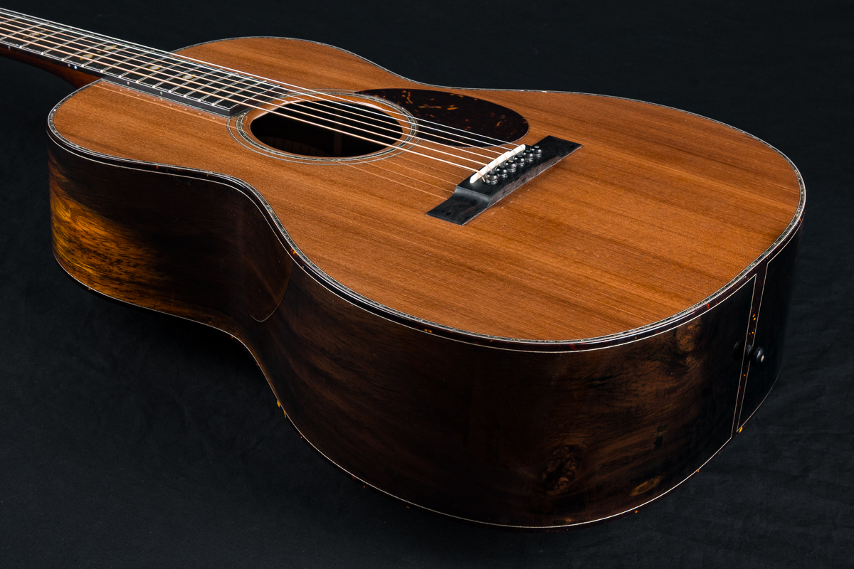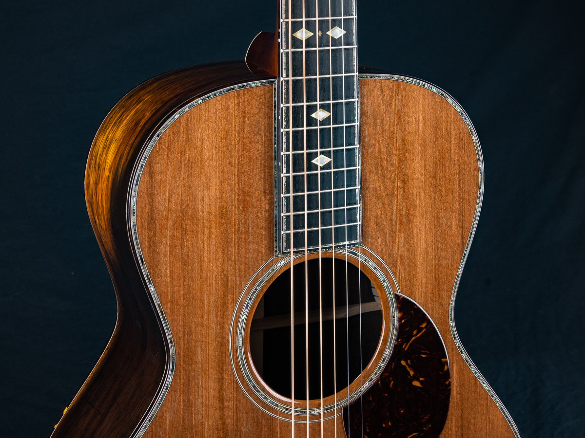 The H13 is Santa Cruz’s 13-fret deeper body build. Similar to a 000 but in the vein of the early 20th century Nick Lucas models, SCGC’s concept for the H13 is to achieve power beyond what would be expected in a small-bodied guitar. Two fundamental lutherie tricks make this possible: a longer string length (more downward pressure at the saddle) and more air space via a deeper body (increased volume and bass response). To place the bridge in the optimal position for power and maintain the longer string length, the neck needs to join the body at the 13th fret.