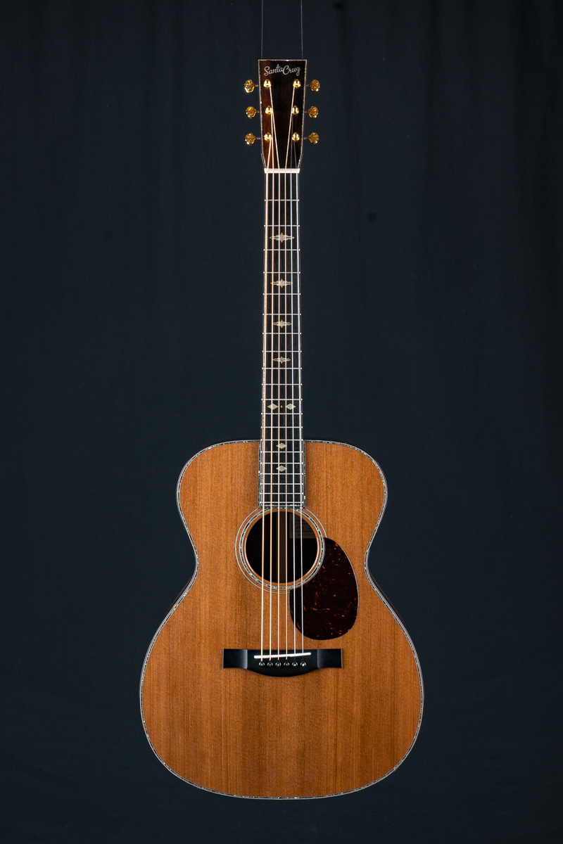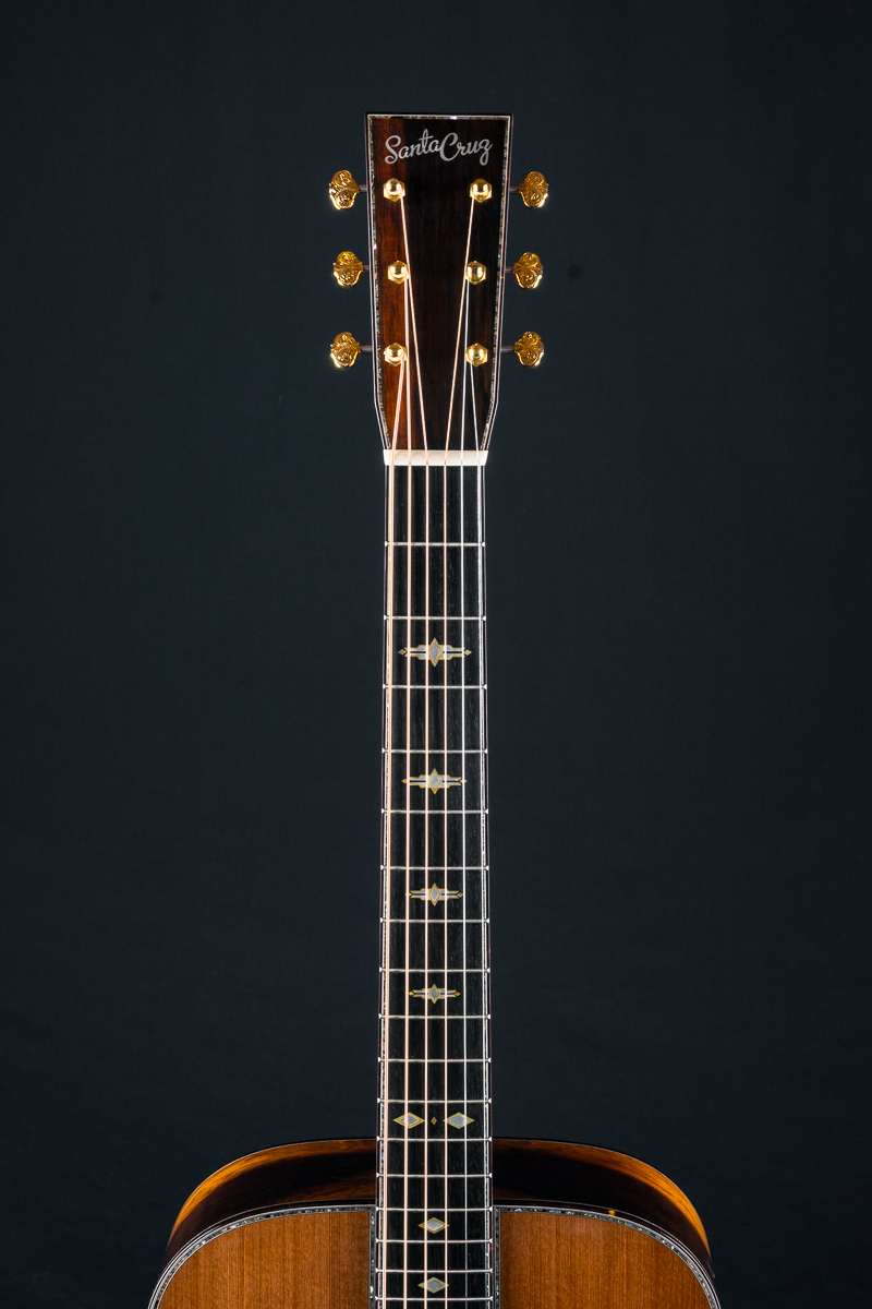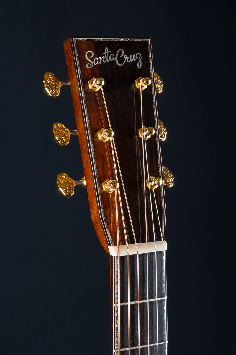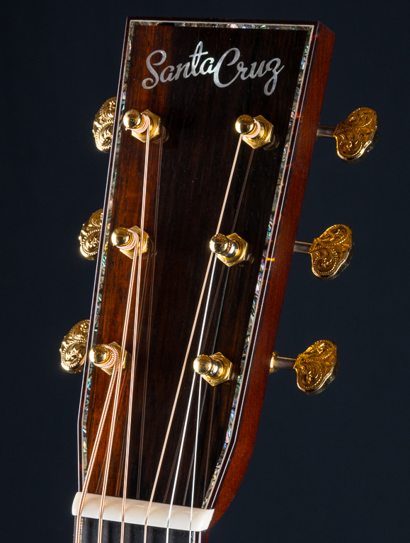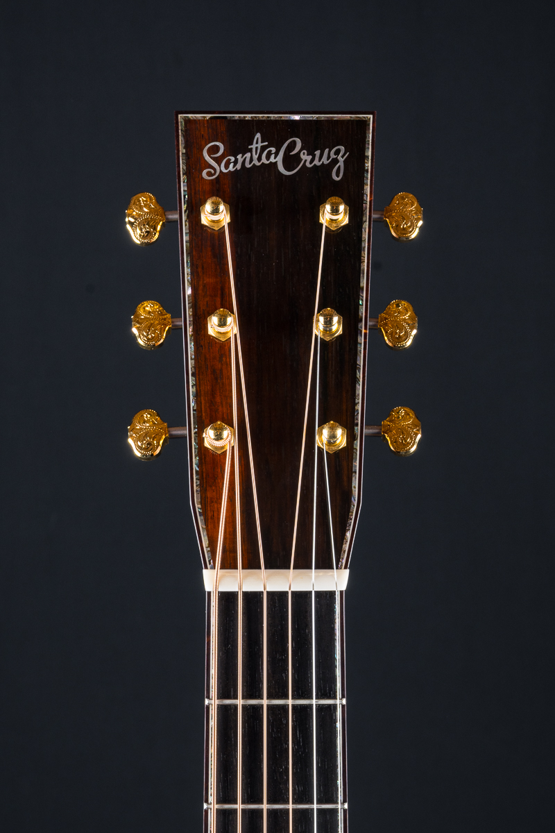 Other features include Bryn Athyn Cathedral Brazilian Rosewood peghead overlay, Ebony fretboard and bridge, Mother of Pearl Santa Cruz script logo, Moderne Vault fingerboard inlay, Waverly Gold engraved tuners, Adirondack Spruce bracing, Hide Glue construction, Mahogany neck, Ebony pins with Abalone dots, 1 3/4″ nut width, 25.375″ scale length and more.