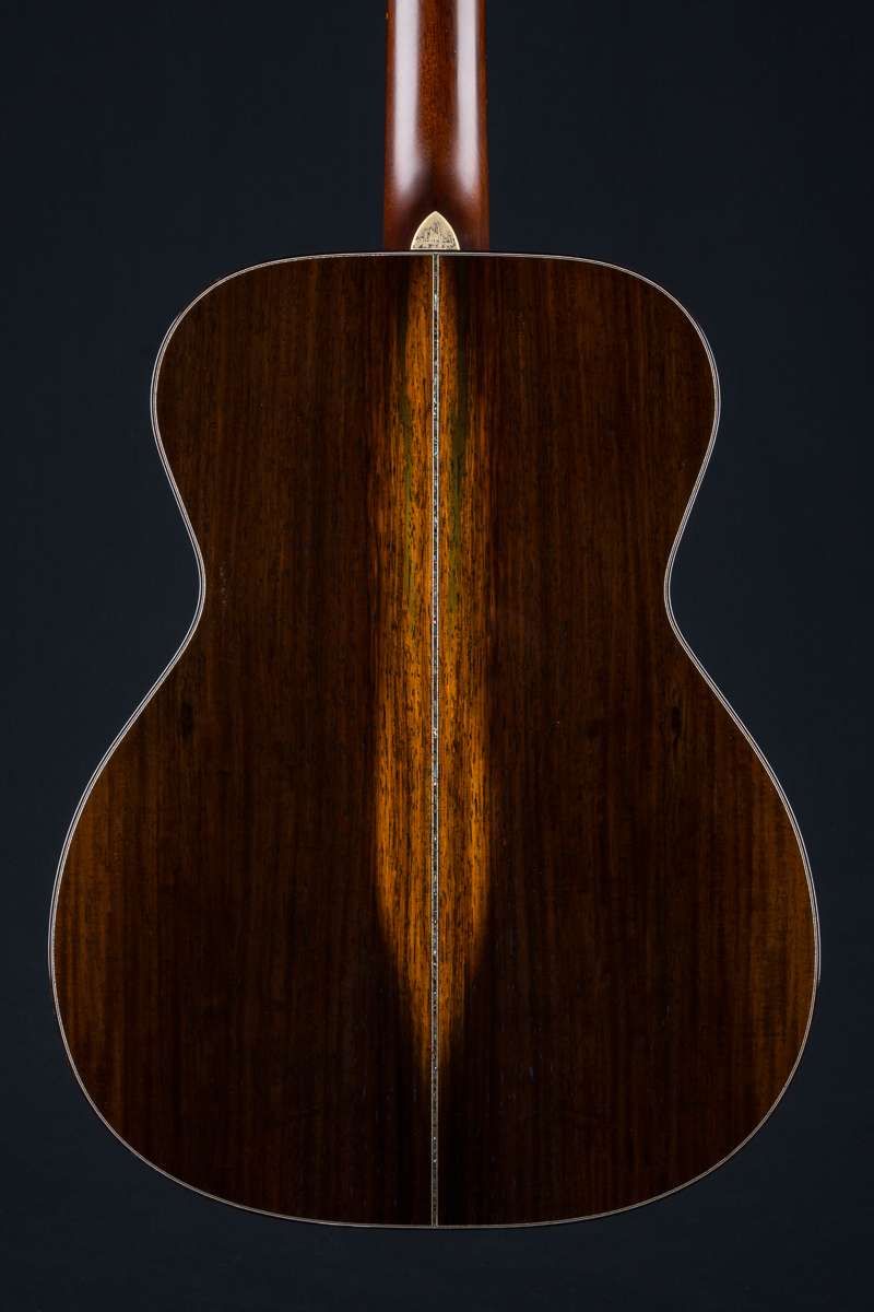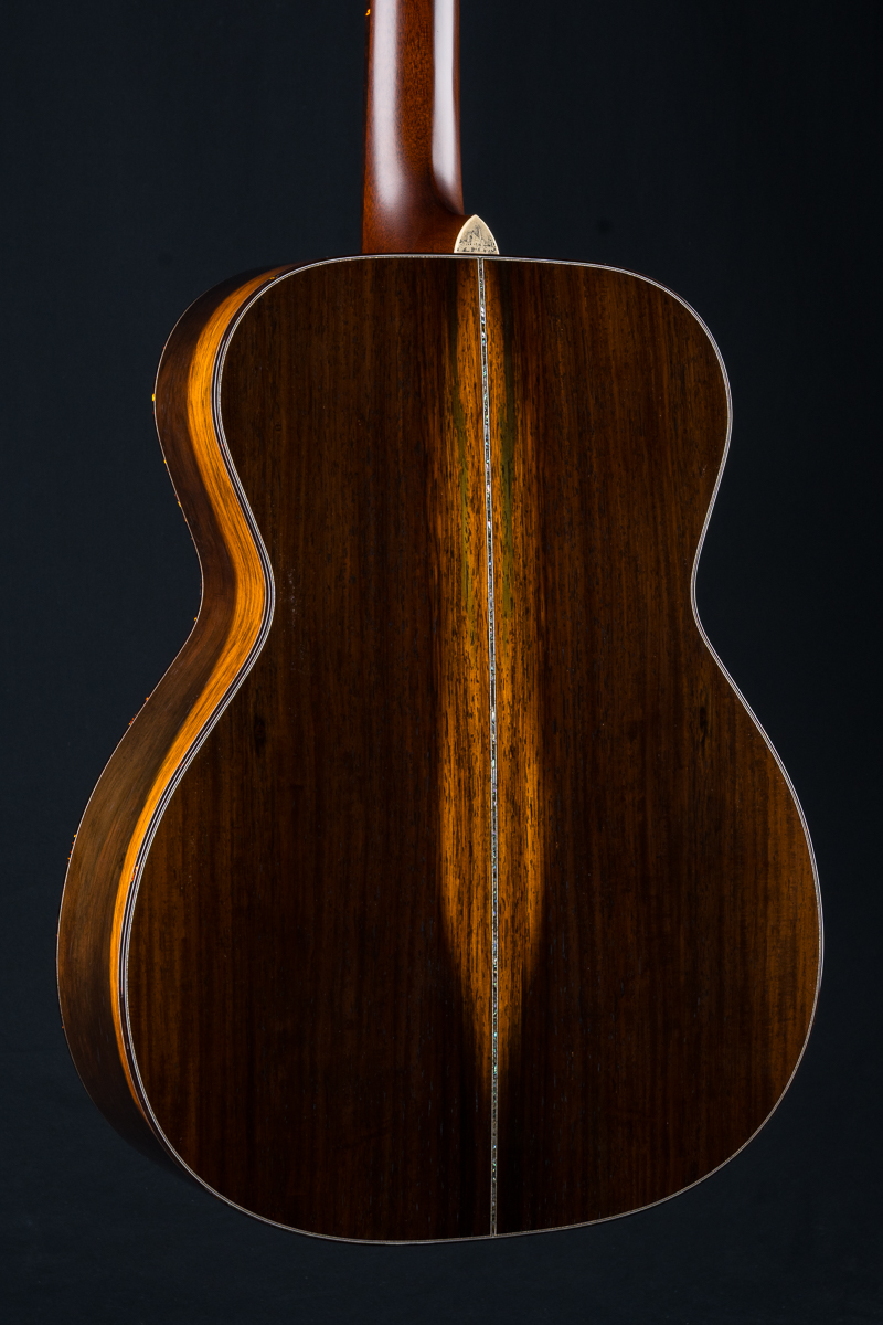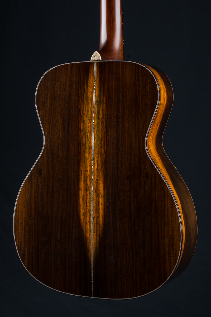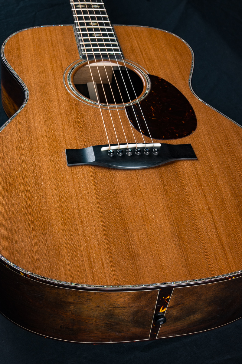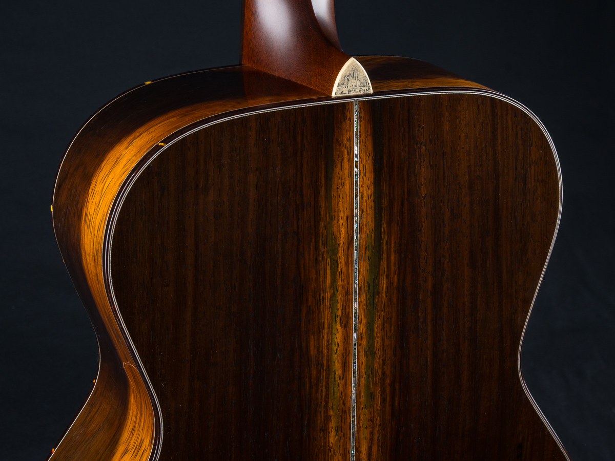 The OM-42 Cathedral is a guitar to behold. The major components of this build have hallowed origins. First, the heart-swelling 125+ year old example of beautiful Brazilian Rosewood that comprises the body of this instrument comes from a board Richard Hoover from SCGC acquired that was abandoned in a stonewalled room of the Bryn Athyn Cathedral in Pennsylvania. Originally sourced in the late 1800’s/ turn of the century for inner adornments and lining of the Pennsylvanian cathedral, some leftover quartered Brazilian Rosewood was left to age to perfection in this stone room which is akin to a cave for consistent temperature and humidity- the most ideal conditions to age this extremely rare wood for the past 125+ years. Beautiful in color and contrast, this wood is just not found at this age and stored condition. A collector’s set of premium Brazilian Rosewood from hallowed grounds.