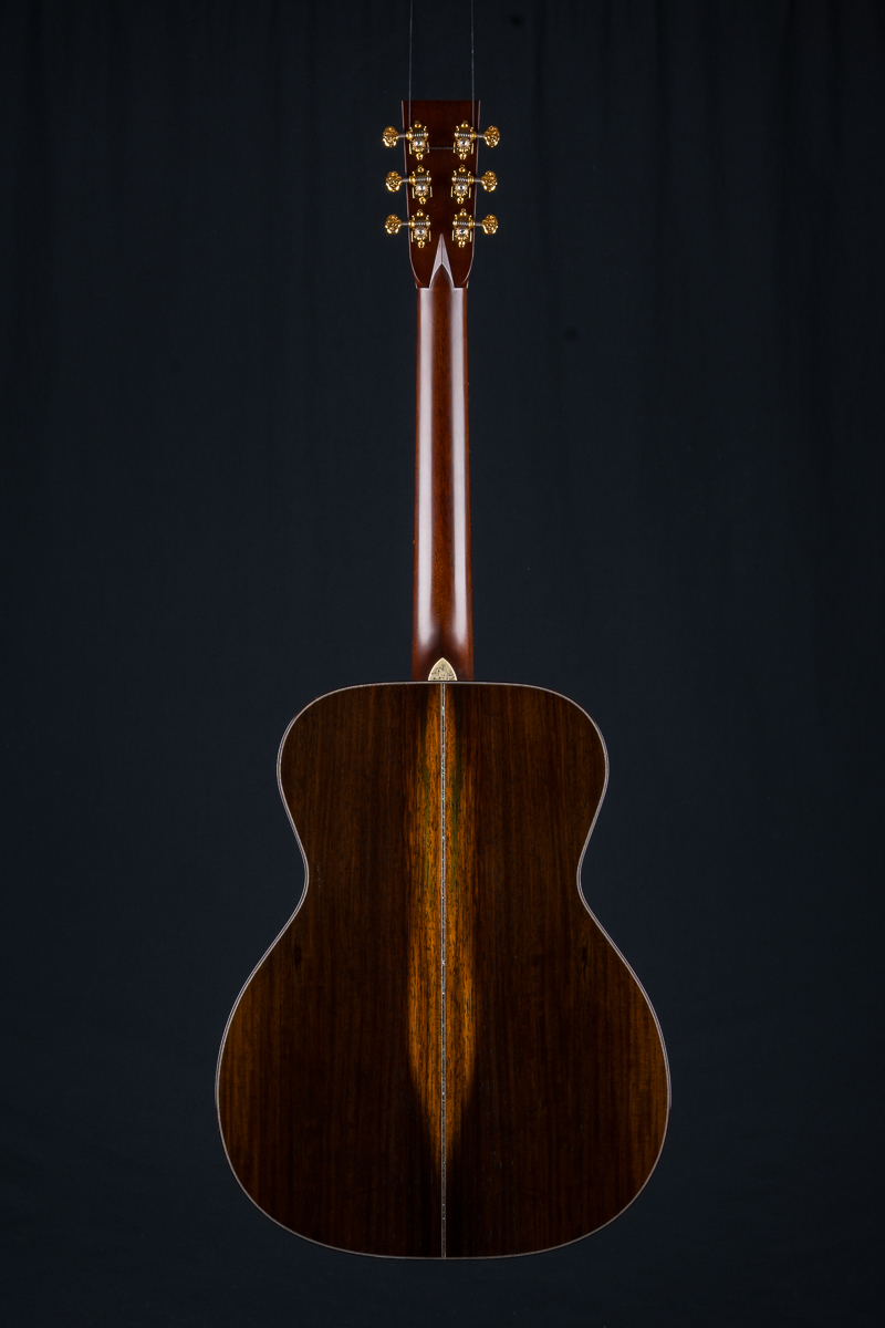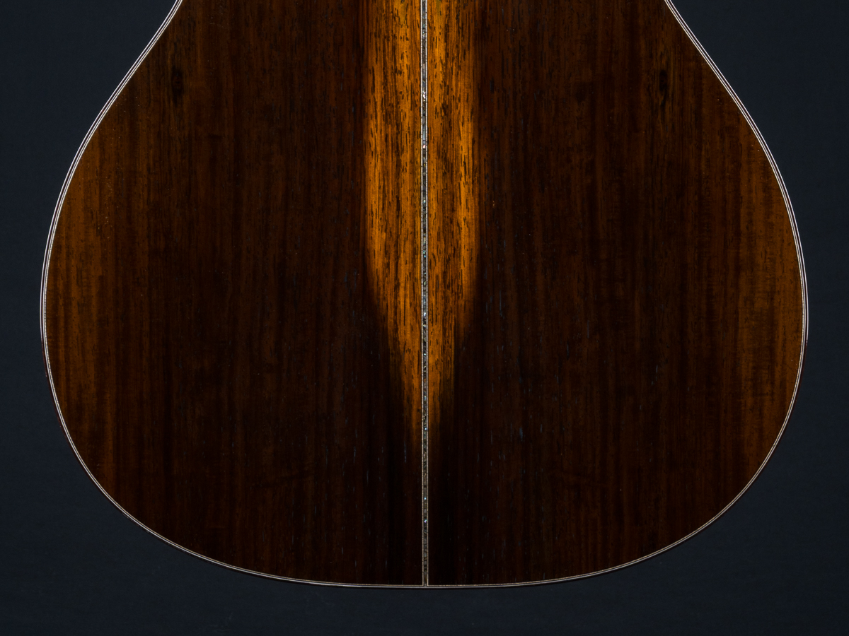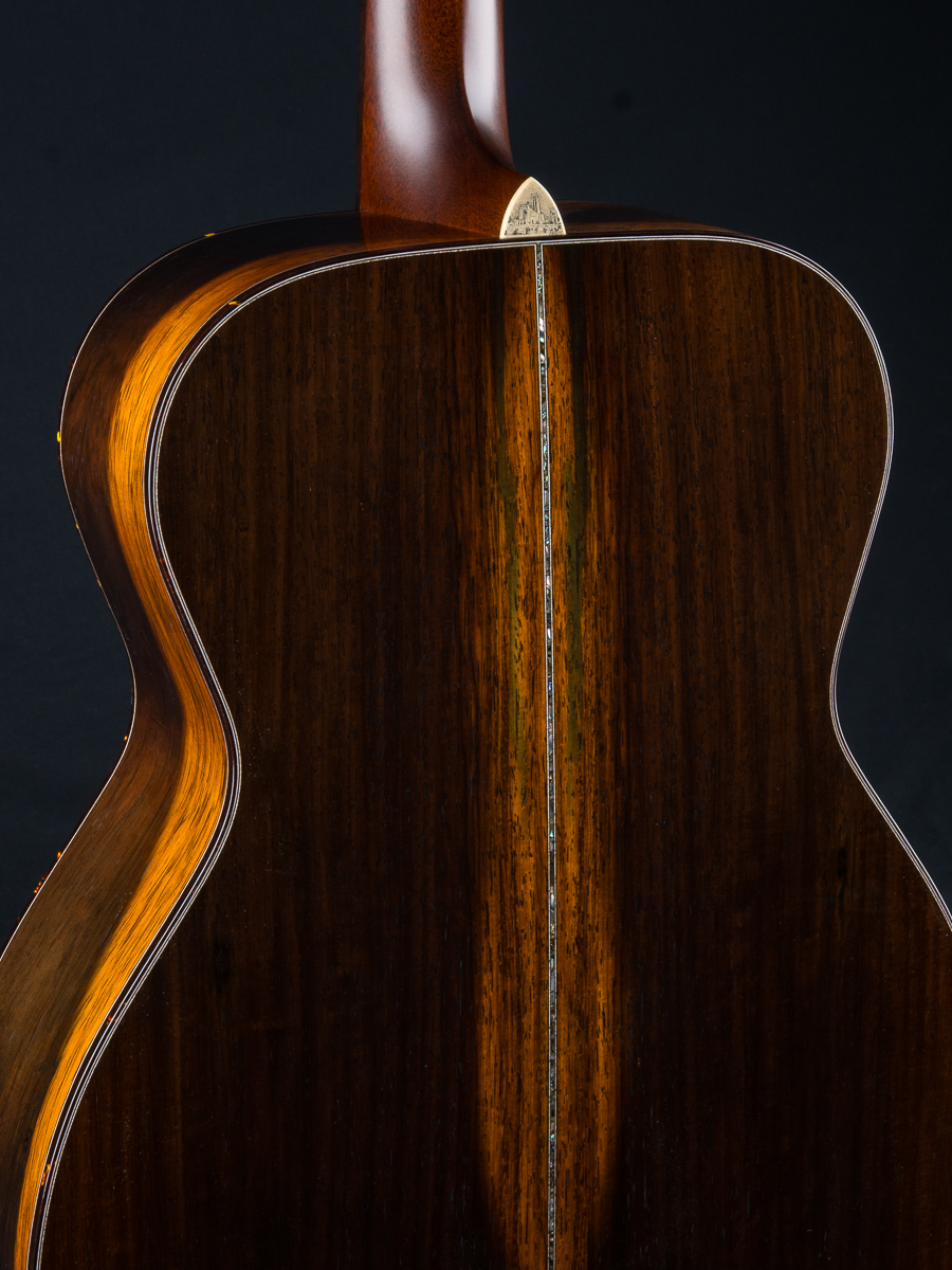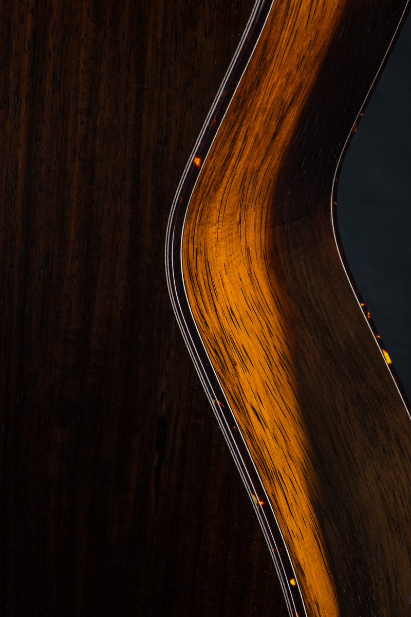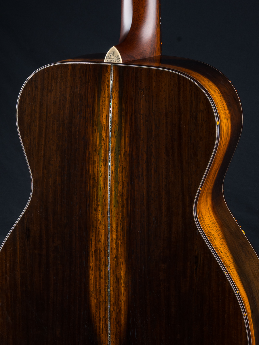 The OM-42 Cathedral is a guitar to behold. The major components of this build have hallowed origins. First, the heart-swelling 125+ year old example of beautiful Brazilian Rosewood that comprises the body of this instrument comes from a board Richard Hoover from SCGC acquired that was abandoned in a stonewalled room of the Bryn Athyn Cathedral in Pennsylvania. Originally sourced in the late 1800’s/ turn of the century for inner adornments and lining of the Pennsylvanian cathedral, some leftover quartered Brazilian Rosewood was left to age to perfection in this stone room which is akin to a cave for consistent temperature and humidity- the most ideal conditions to age this extremely rare wood for the past 125+ years. Beautiful in color and contrast, this wood is just not found at this age and stored condition. A collector’s set of premium Brazilian Rosewood from hallowed grounds.