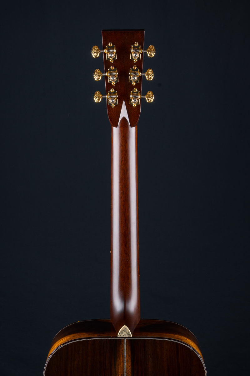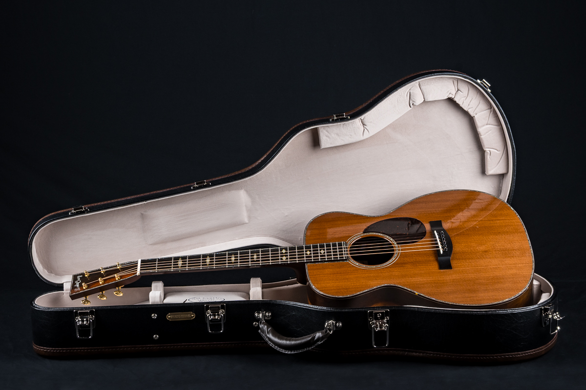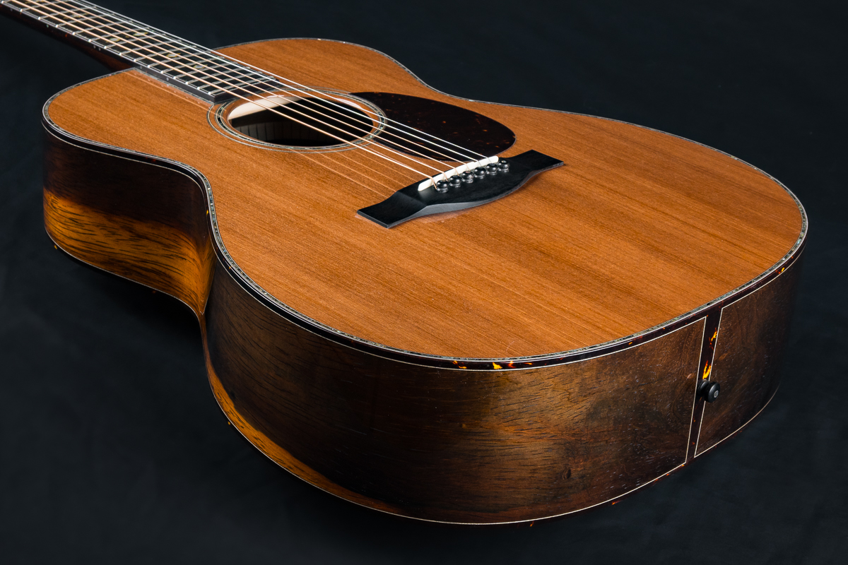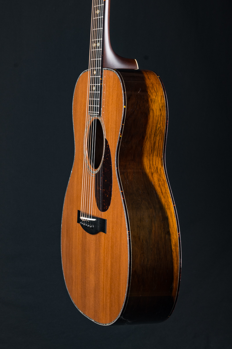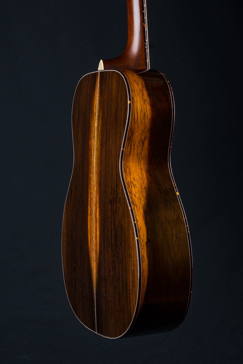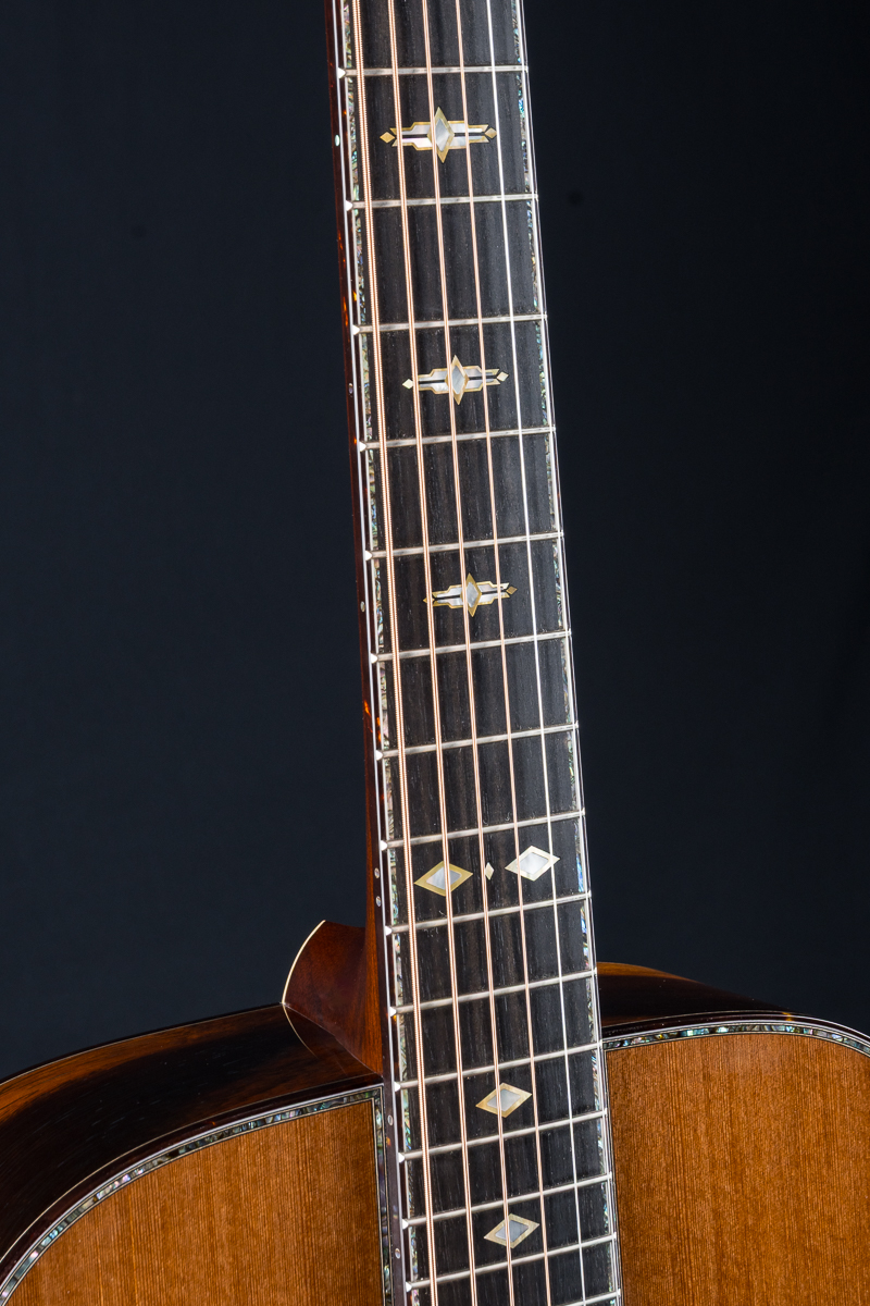 The OM-42 Cathedral is a guitar to behold. The major components of this build have hallowed origins. First, the heart-swelling 125+ year old example of beautiful Brazilian Rosewood that comprises the body of this instrument comes from a board Richard Hoover from SCGC acquired that was abandoned in a stonewalled room of the Bryn Athyn Cathedral in Pennsylvania. Originally sourced in the late 1800’s/ turn of the century for inner adornments and lining of the Pennsylvanian cathedral, some leftover quartered Brazilian Rosewood was left to age to perfection in this stone room which is akin to a cave for consistent temperature and humidity- the most ideal conditions to age this extremely rare wood for the past 125+ years. Beautiful in color and contrast, this wood is just not found at this age and stored condition. A collector’s set of premium Brazilian Rosewood from hallowed grounds.