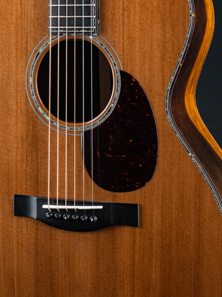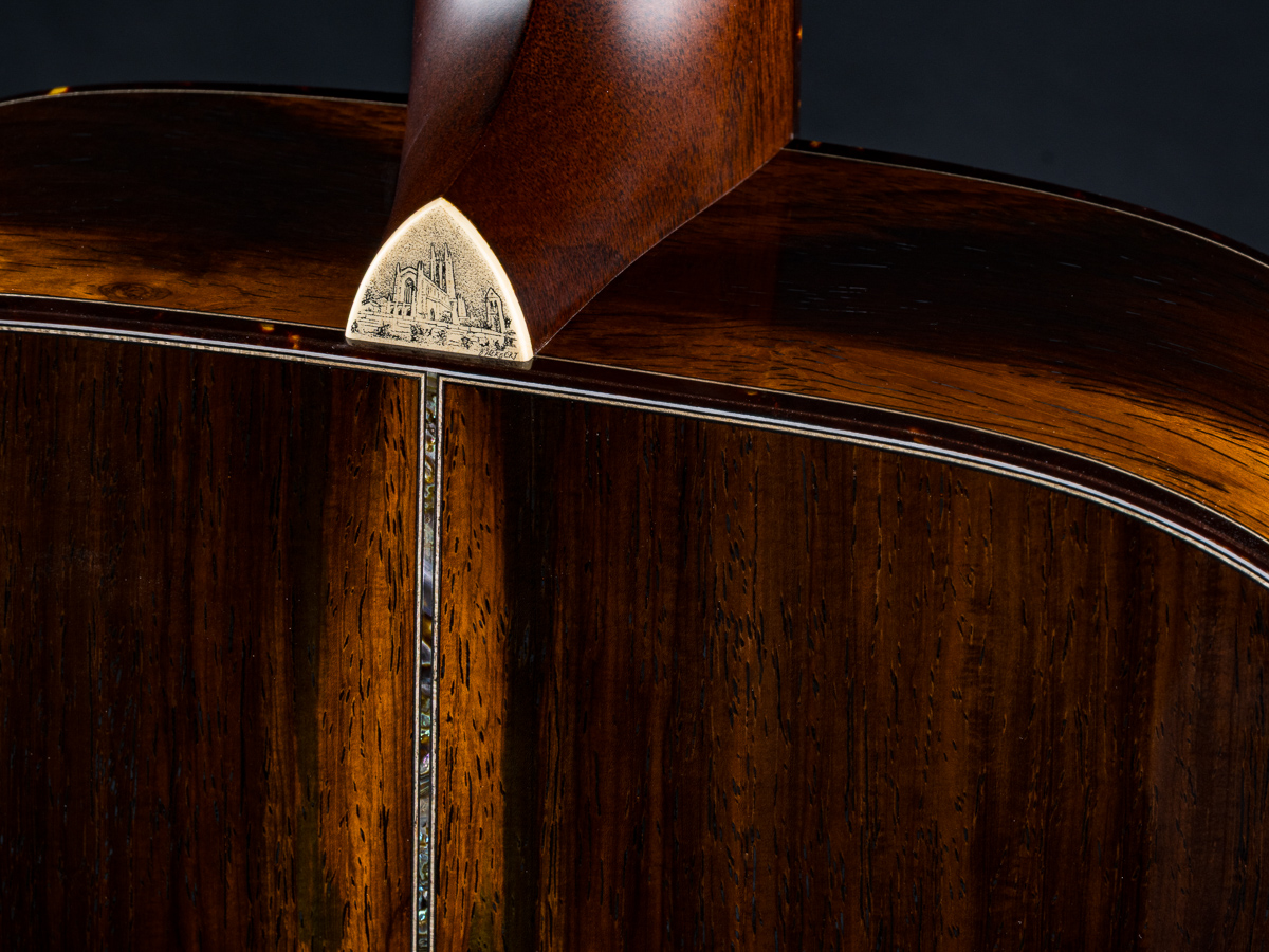 The OM-42 Cathedral features Abalone Pearl 42-style top purfling, rosette, fretboard trim, headstock trim and back strip, Gold Pearl and Mother of Pearl Moderne fretboard and headstock inlays plus backlit tortoise full body, fretboard and headstock bindings tying it all together. The handmade scrimshaw “Cathedral” heelcap is work of art in itself hand done with intricate detail of the Bryn Athyn Cathedral.
