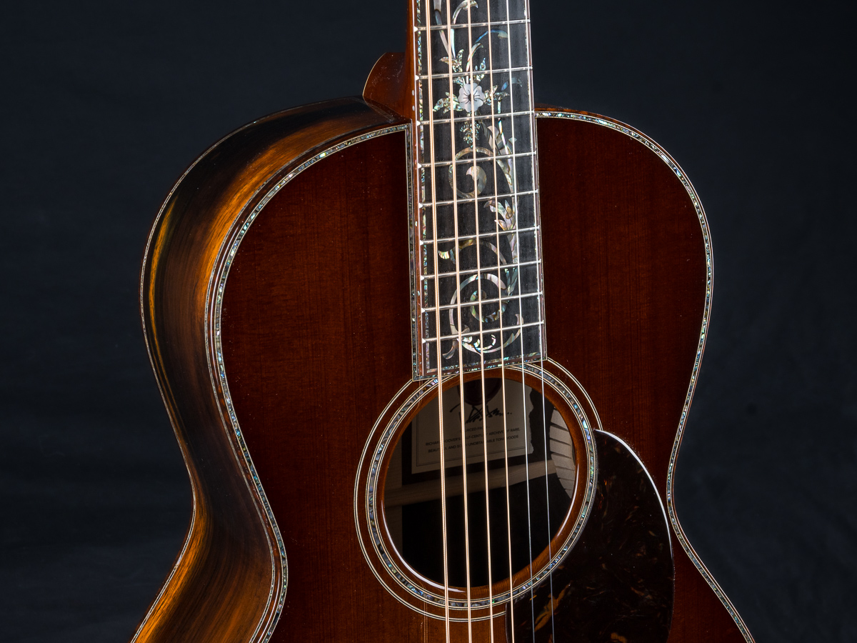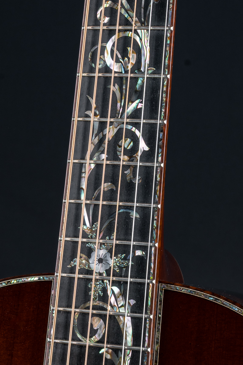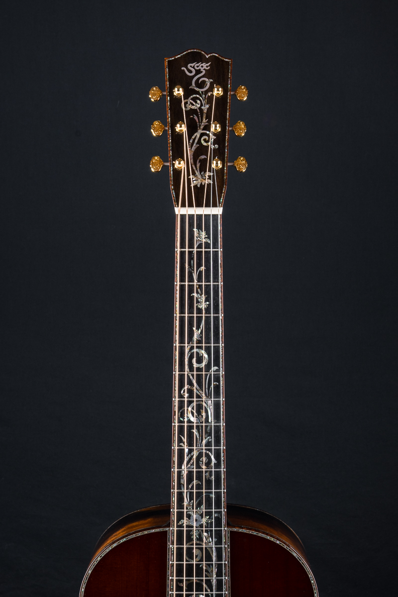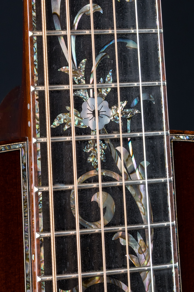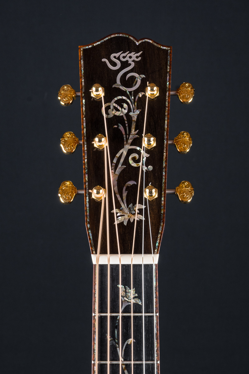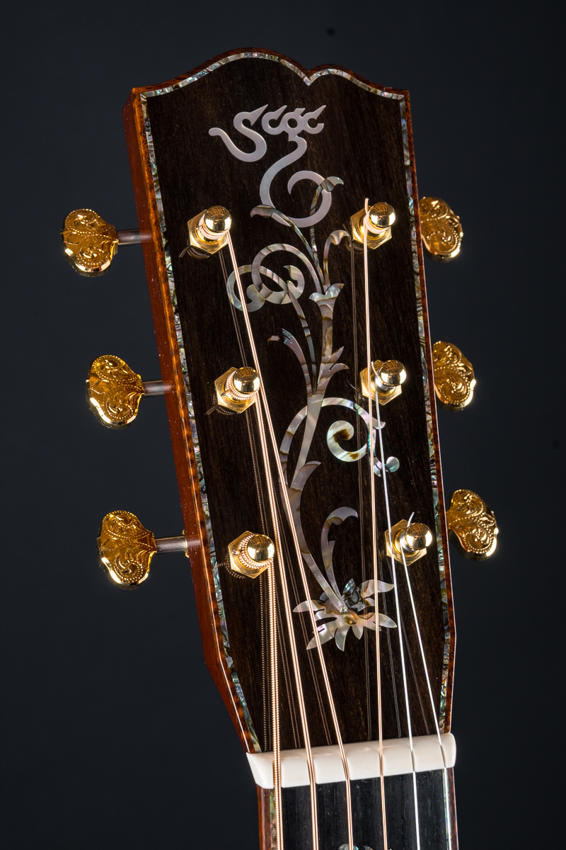 This one of a kind 12-fret build features extremely rare Vault grade 125+ year old Bryan Athyn Cathedral Brazilian Rosewood back and sides paired with historic Vault grade Tunnel 13 Redwood top with custom shaded burst- literally the last set of this storied wood available. Richard Hoover seriously saved the best for last. Artistically matched features include Abalone Pearl ‘Tree Of Life’ fretboard and headstock overlays, vivid Abalone Pearl 45-style trim on every edge- top, back, sides, fretboard, headstock, neck heel, backstrip and custom wedge, Abalone Pearl fretboard and headstock trim, full Snakewood body, fretboard and headstock bindings and Waverly Gold engraved tuners.