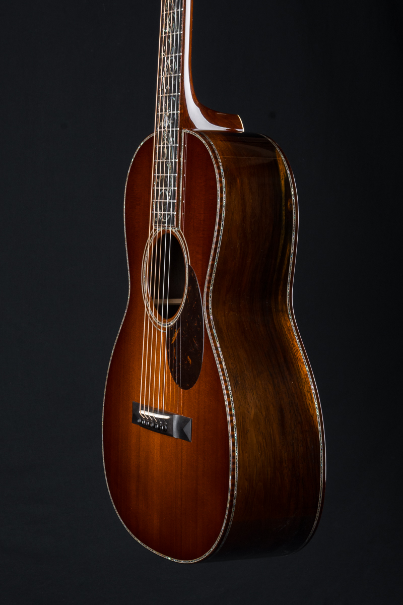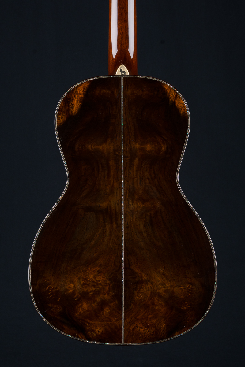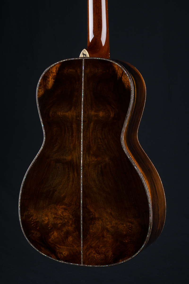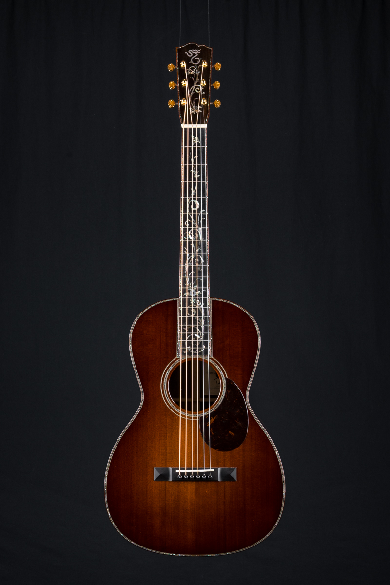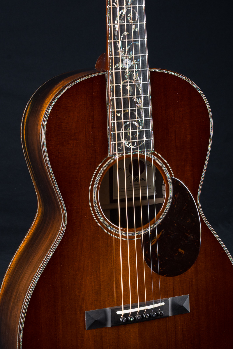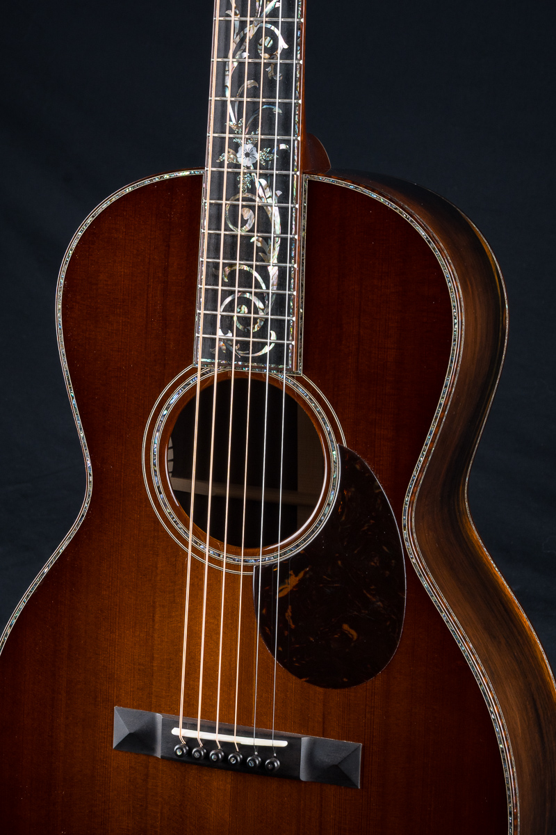 This one of a kind 12-fret build features extremely rare Vault grade 125+ year old Bryan Athyn Cathedral Brazilian Rosewood back and sides paired with historic Vault grade Tunnel 13 Redwood top with custom shaded burst- literally the last set of this storied wood available. Richard Hoover seriously saved the best for last. Artistically matched features include Abalone Pearl ‘Tree Of Life’ fretboard and headstock overlays, vivid Abalone Pearl 45-style trim on every edge- top, back, sides, fretboard, headstock, neck heel, backstrip and custom wedge, Abalone Pearl fretboard and headstock trim, full Snakewood body, fretboard and headstock bindings and Waverly Gold engraved tuners.