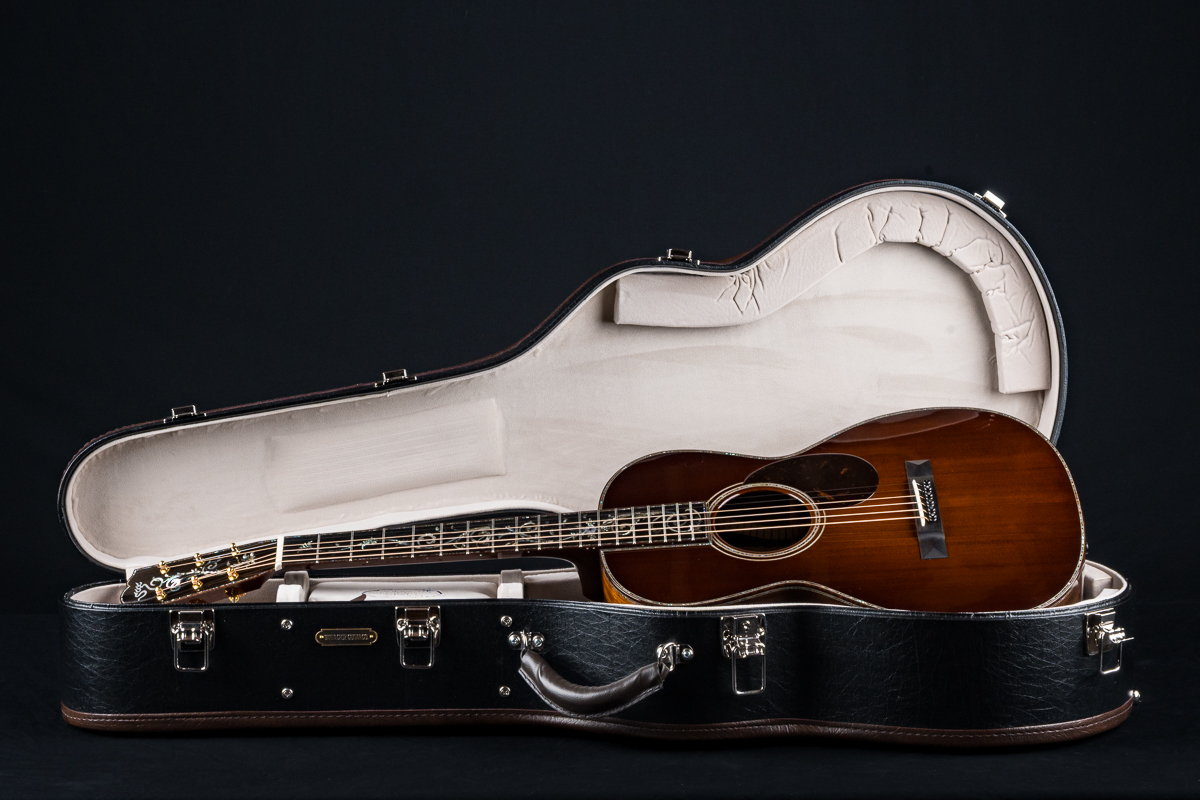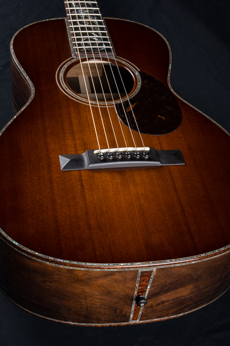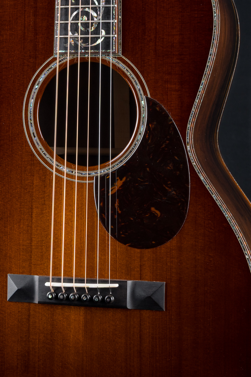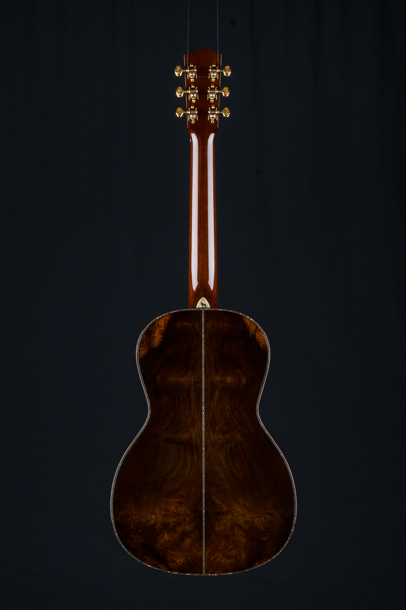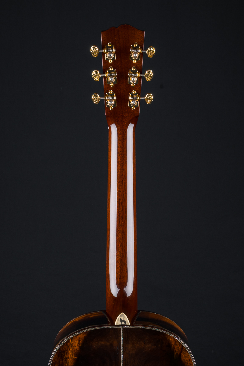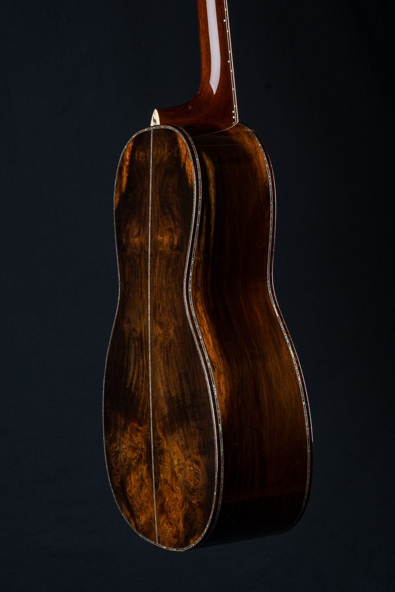 This one of a kind 12-fret build features extremely rare Vault grade 125+ year old Bryan Athyn Cathedral Brazilian Rosewood back and sides paired with historic Vault grade Tunnel 13 Redwood top with custom shaded burst- literally the last set of this storied wood available. Richard Hoover seriously saved the best for last. Artistically matched features include Abalone Pearl ‘Tree Of Life’ fretboard and headstock overlays, vivid Abalone Pearl 45-style trim on every edge- top, back, sides, fretboard, headstock, neck heel, backstrip and custom wedge, Abalone Pearl fretboard and headstock trim, full Snakewood body, fretboard and headstock bindings and Waverly Gold engraved tuners.