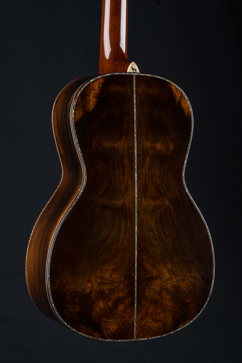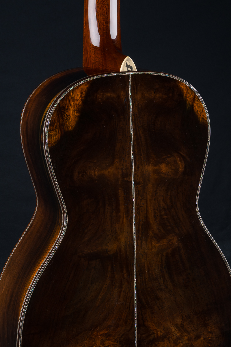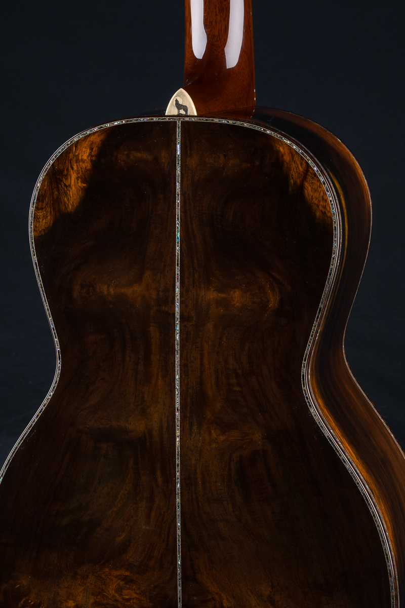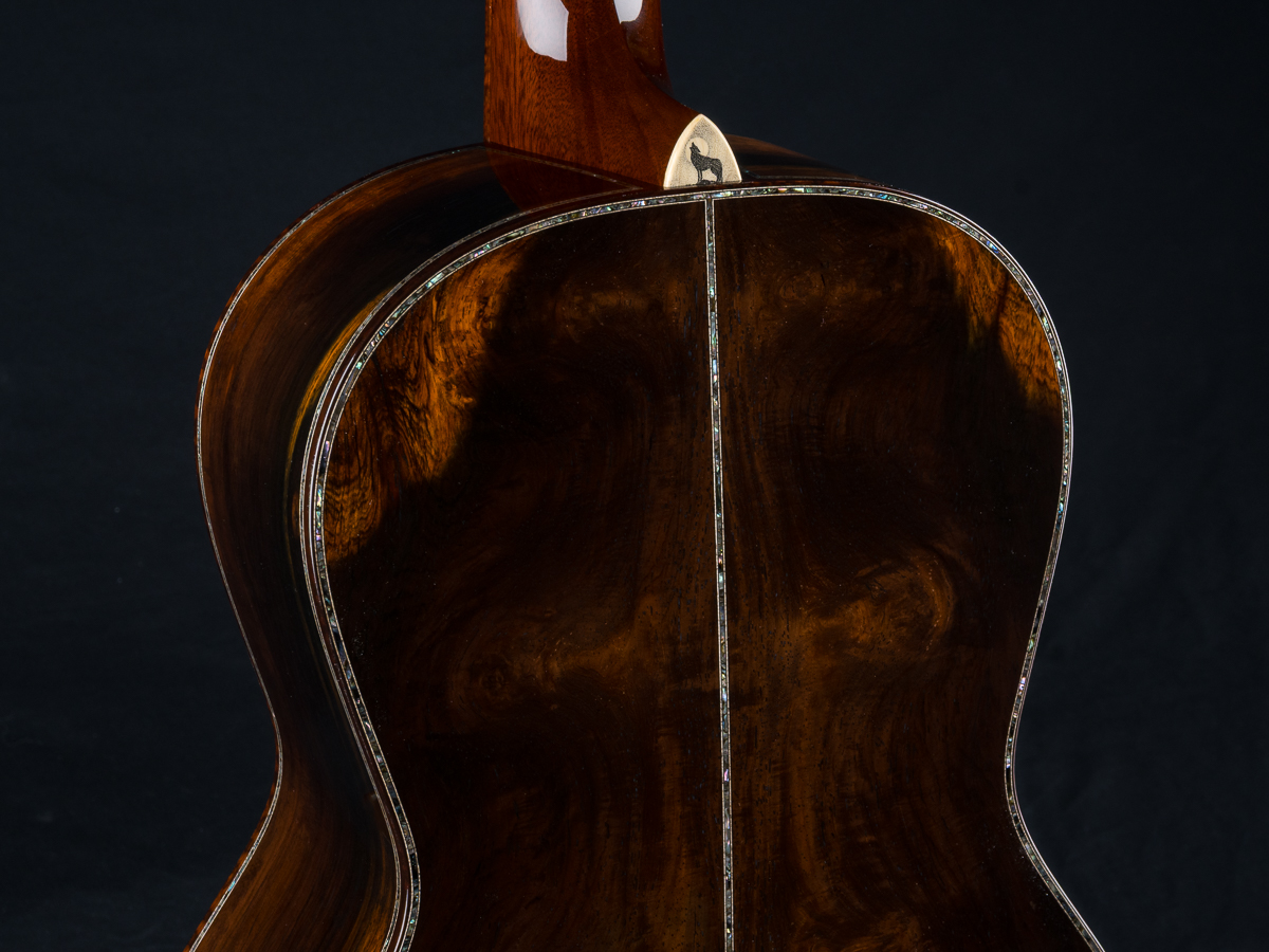 The handmade scrimshaw “howling wolf” heelcap is work of art in itself hand done with intricate detail. Other features include Bryn Athyn Cathedral Brazilian Rosewood peghead overlay, Adirondack Spruce bracing, hot hide glue construction, Abalone Pearl backstrip, Ebony fretboard and pyramid bridge, Mahogany buffed neck with haircut headstock, Snakewood custom wedge, Ebony pins with Abalone dots, 1 3/4″ nut width and 24.75″ short scale length.